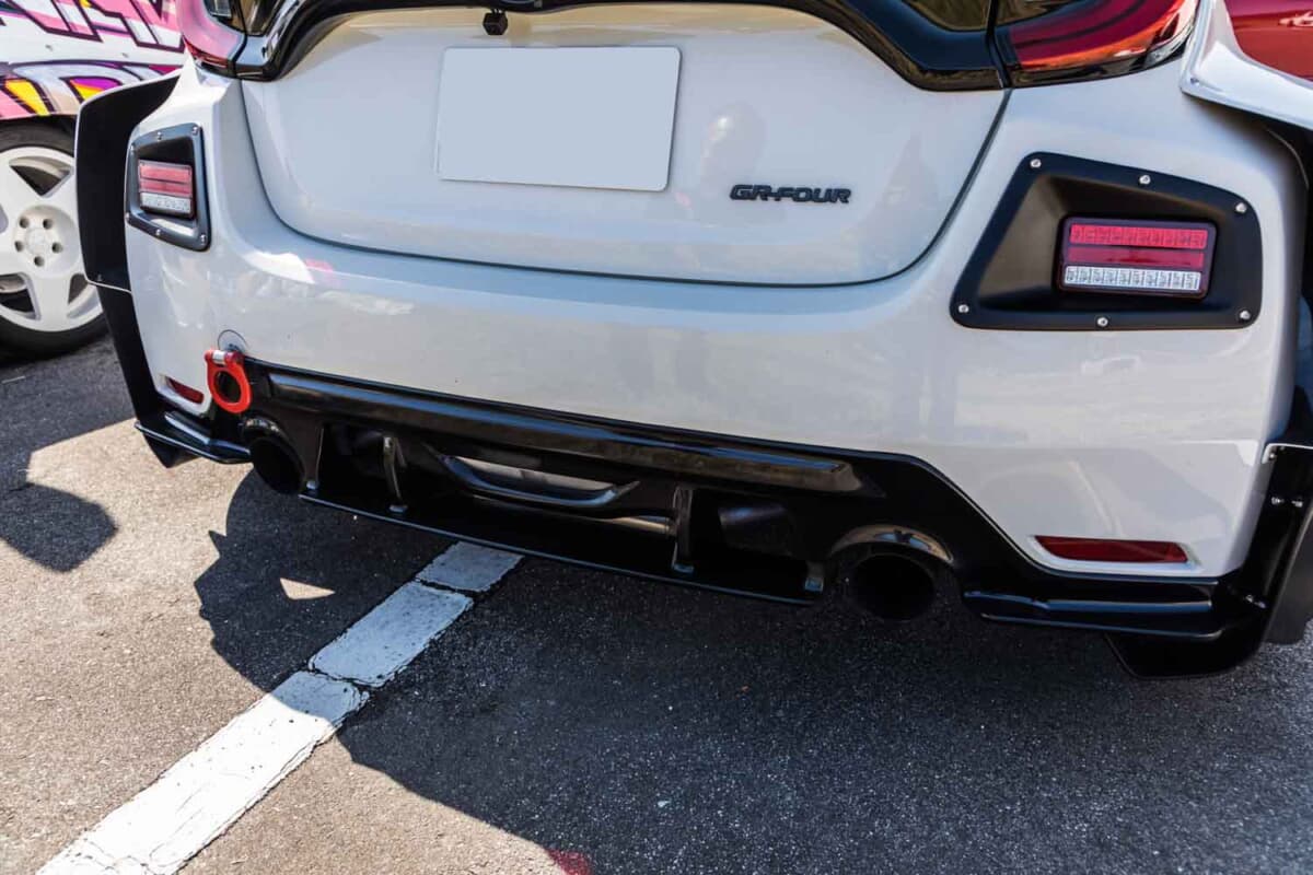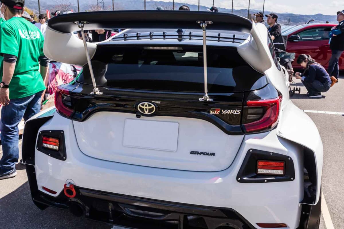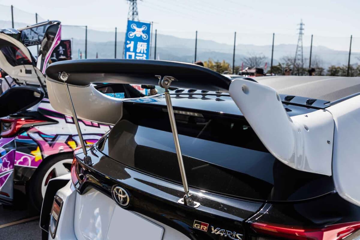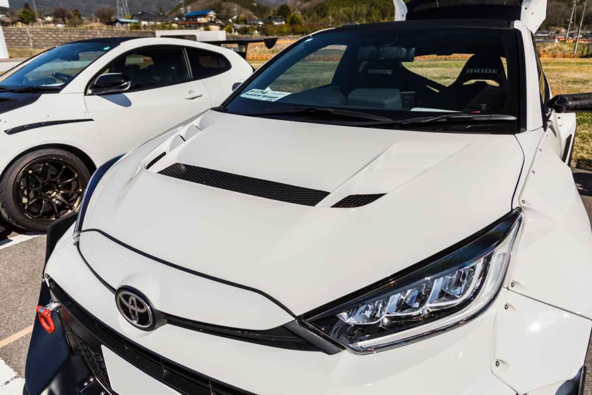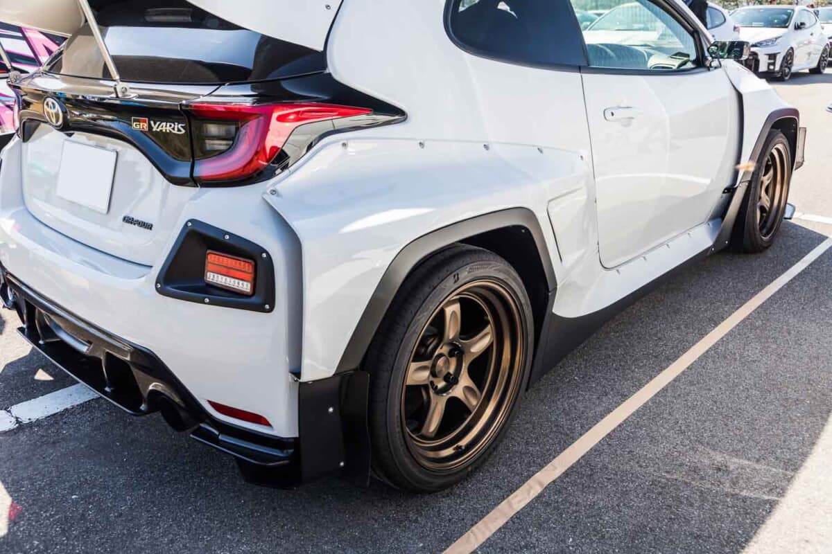 GRヤリスミーティングが行われた長野県飯田市のS-BIRDに、個性的なカスタムを施したトヨタ「GRヤリス」が全国各地から多数集結しました。標準のヤリスより拡幅されたGRヤリスのボディを、さらに社外のボディキットで拡幅した個性的な車両をイベント会場で発見しました。気になるカスタム内容を紹介します。