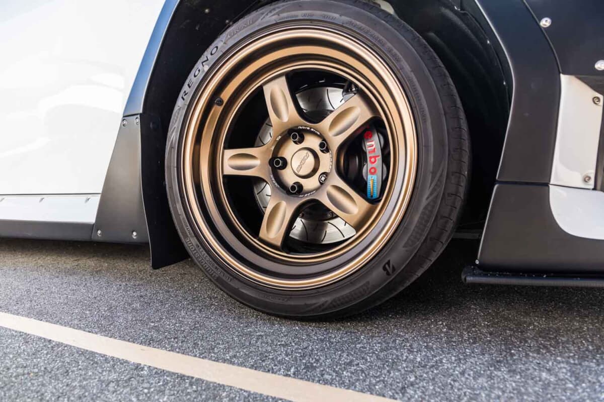 ちなみにこれほど拡幅されていると、装着するホイールも必然的にかなりワイドリムになります。取材時に装着していたのは、RAYSの「VR.G21」でサイズは18×9.5J インセット0。これにフロント15mm、リア30mmのスペーサーを併用しています。タイヤは265/35R18サイズのブリヂストンの「レグノ」のようなストリートタイヤを組み合わせています。