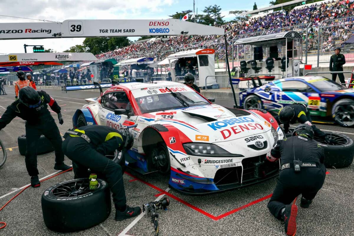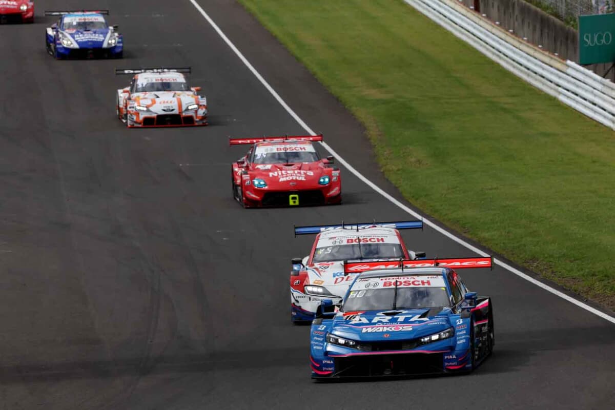 GT500のポールシッターは、2戦連続で16号車 ARTA MUGEN CIVIC TYPE R-GT。2番手には39号車 DENSO KOBELCO SARD GR Supra、3番手には3号車 Niterra MOTUL Zが続いた。いずれも各陣営のなかではサクセスウエイトが比較的軽い車両だ。一方で、4番手にはサクセスウエイトが上限まで達し、燃料流量が3段階ダウンしているポイントリーダーの1号車 au TOM’S GR Supraが食い込んできた。