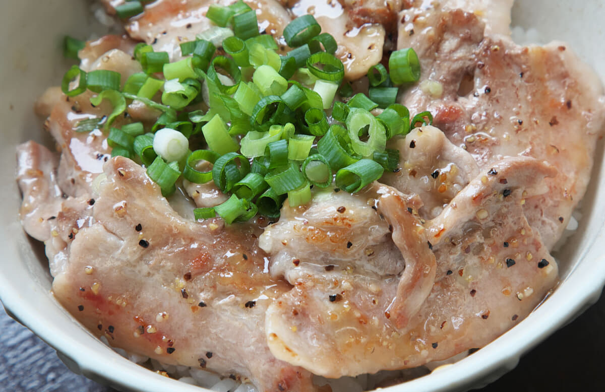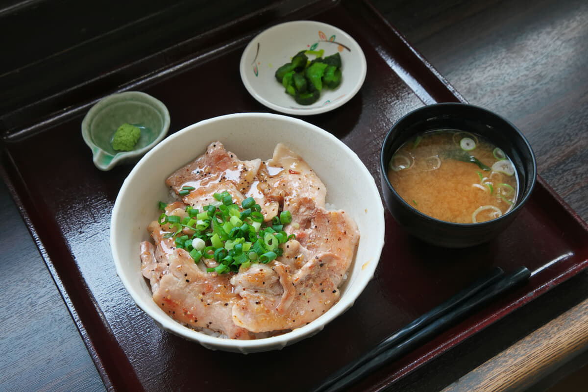 妻有ポークが8枚乗った丼は、融点の低い脂が溶け出してキラキラと輝いて見える。塩だれとネギそしてトッピングとしてわさびを用意。濃い目の味付けの塩だれが妻有ポークの甘さを引き立てる。脂の部分はスッと溶け出すが、肉の部分は歯ごたえもあり噛めば噛むほど甘さが出てくる。