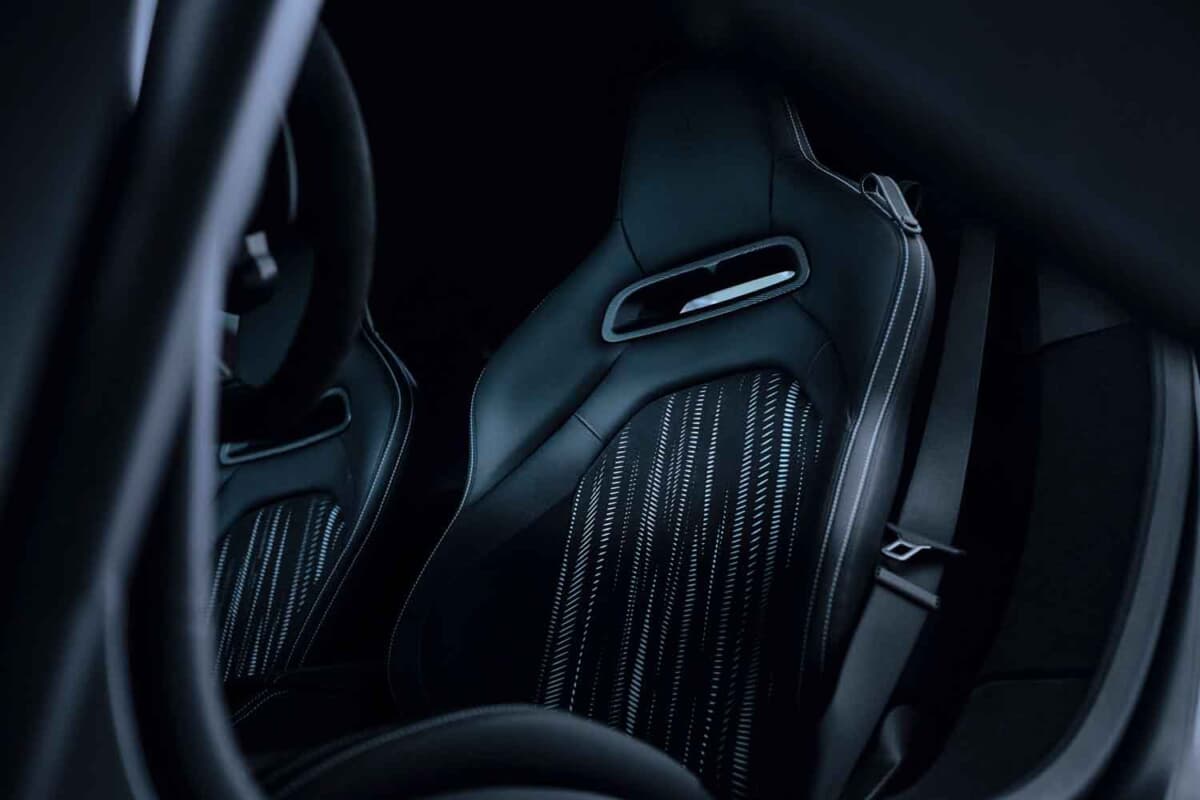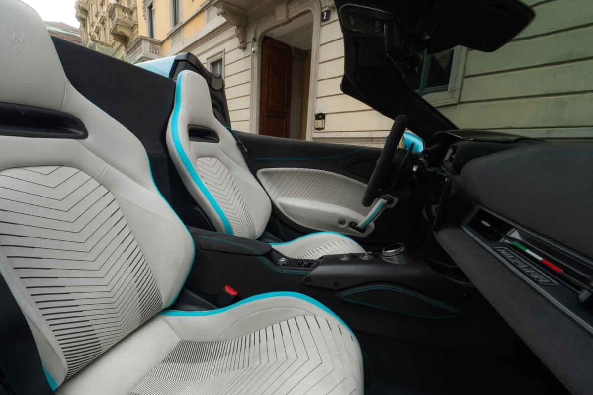 内装では、アイスカラーのアルカンターラをレーザー加工した新デザインのシートを採用。トライデントのロゴを新たなグラフィックで表現し、赤と青のイリデッセント(二色効果)を裏地に用いることで、未来感とスポーティさを両立。シートの立体感を生み出すレーザー加工技術も初採用された。
