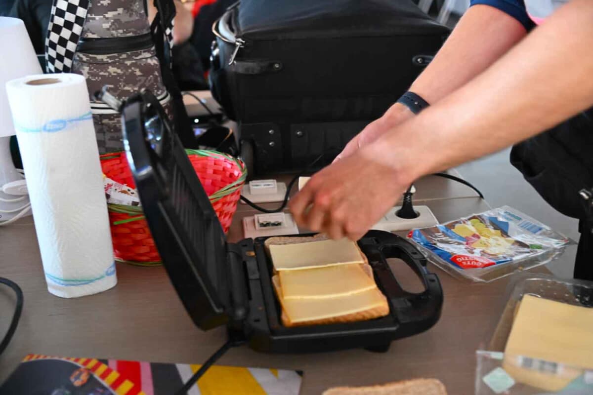 スタートから暫くはオールージュ近辺で撮影をしたりレース観戦をして、一旦メディアセンターへ戻って遅いランチタイムというか、早いディナーのお弁当です。私はホテルでお弁当を作って来ていますが、メディア関係者のなかにはサーキットまでの途中にパン屋さんでバゲットサンドを買って来る人や、サーキットのフードトラックや売店で食べている人、はたまたもうメディアセンターでちょっとした調理をする人など、色々なタイプがいて意外と面白いんです。一番驚いたのは大きなクーラーボックスにさまざまな食糧を入れて、なおかつホットサンドメーカーやコーヒーメーカーなどを持ち込んでいる人までいました。