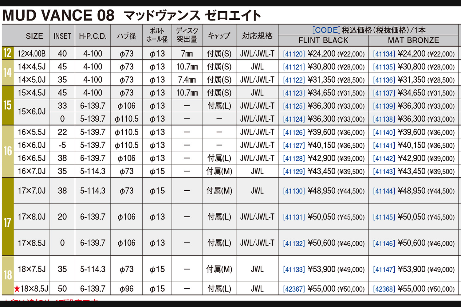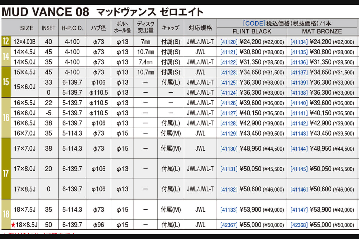 • WEDS ADVENTURE MUD VANCE 08:サイズ&価格一覧