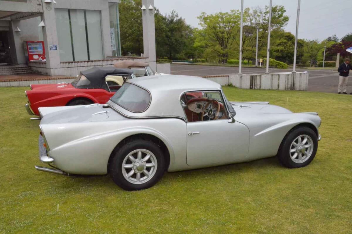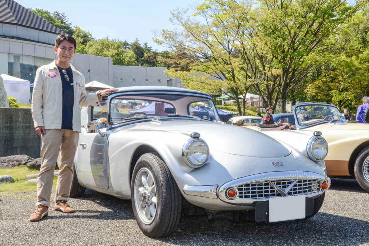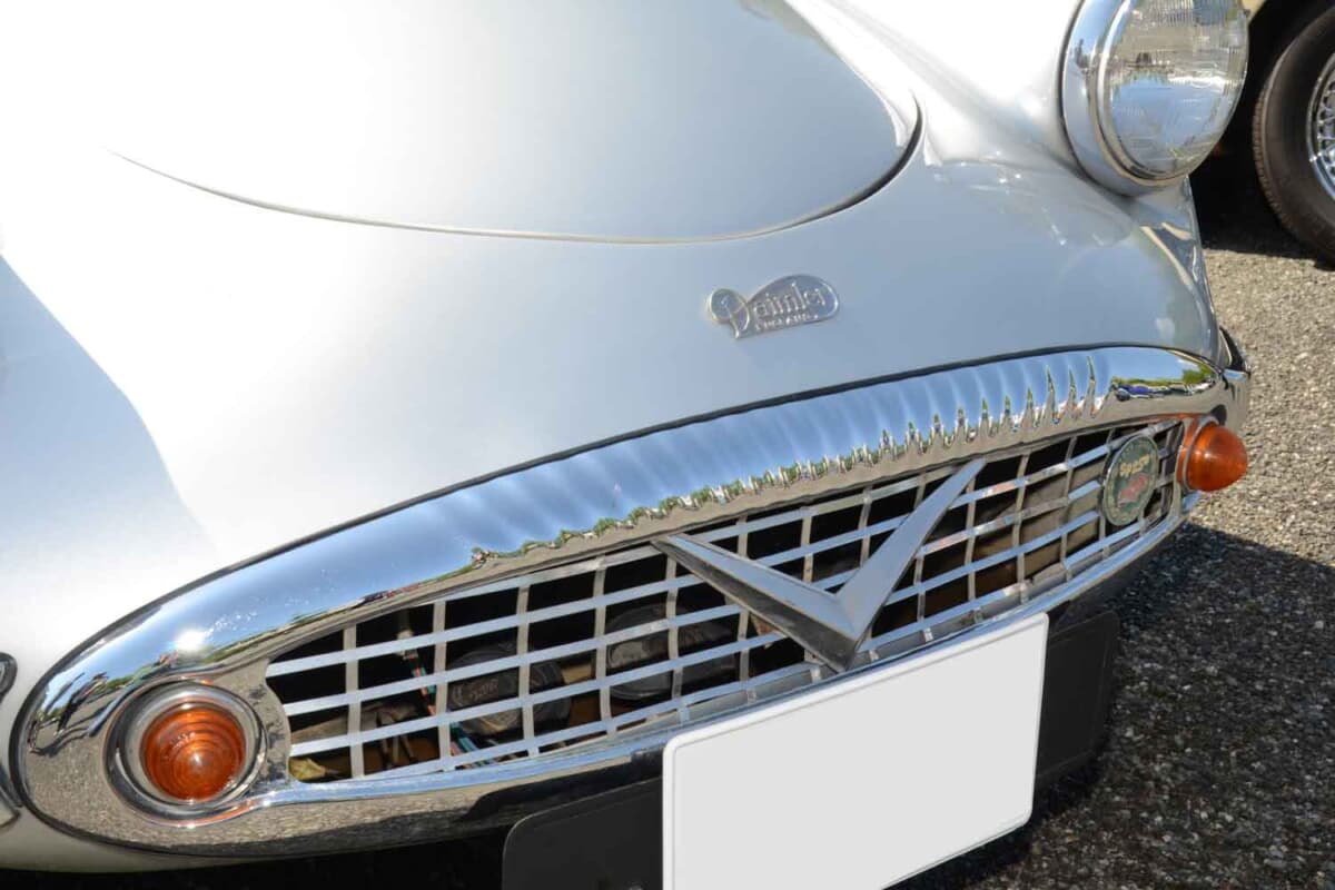 前日までの悪天候から一転、絶好のイベント日和となった5月3日のミーティング当日。会場には約50台のヒストリックカーが展示されたが、なかでもひと際目を引いたのが英国生まれの個性的なスポーツカー、ディムラー SP250だ。