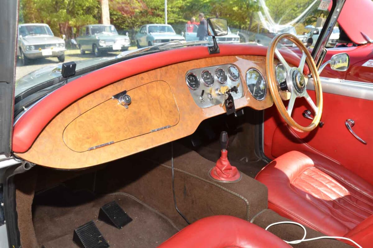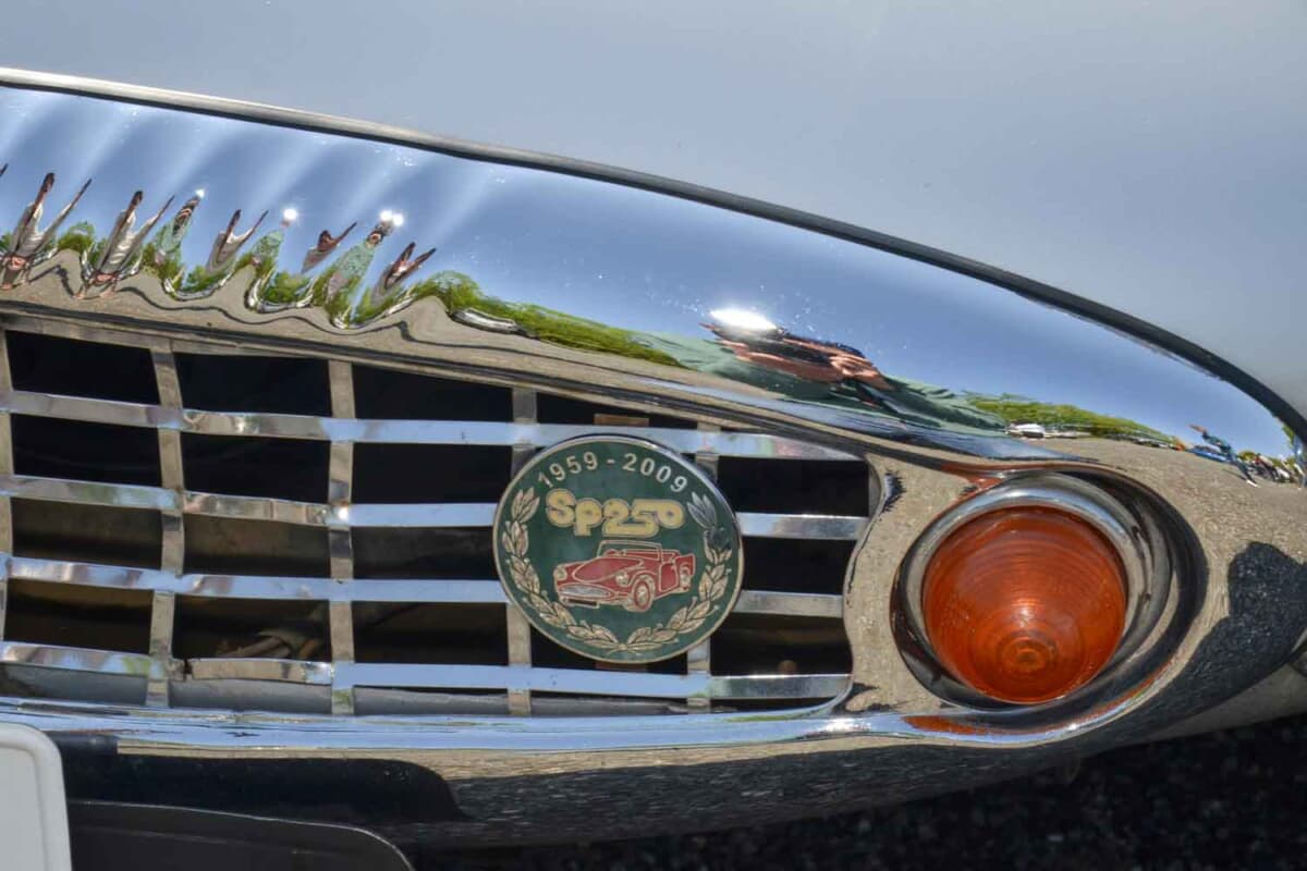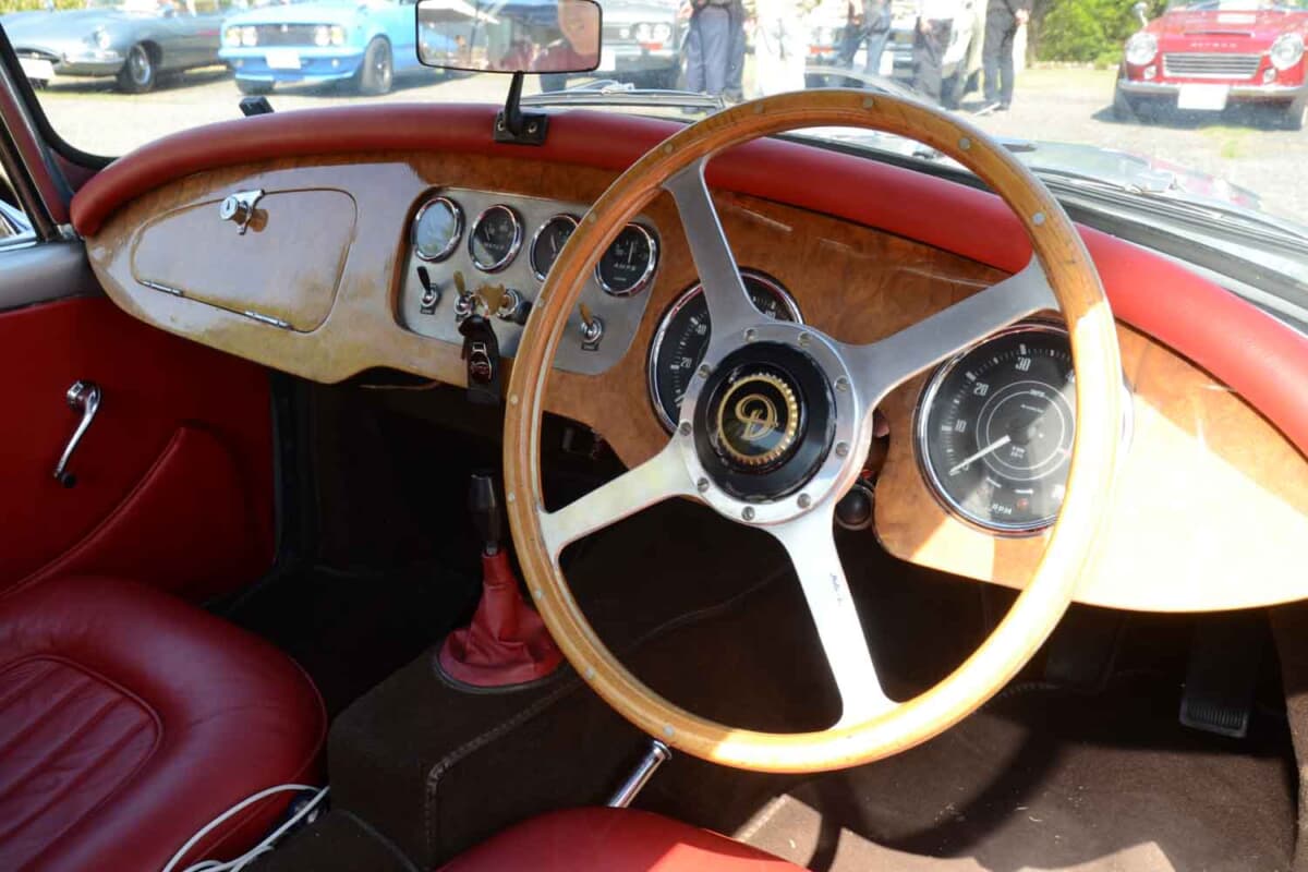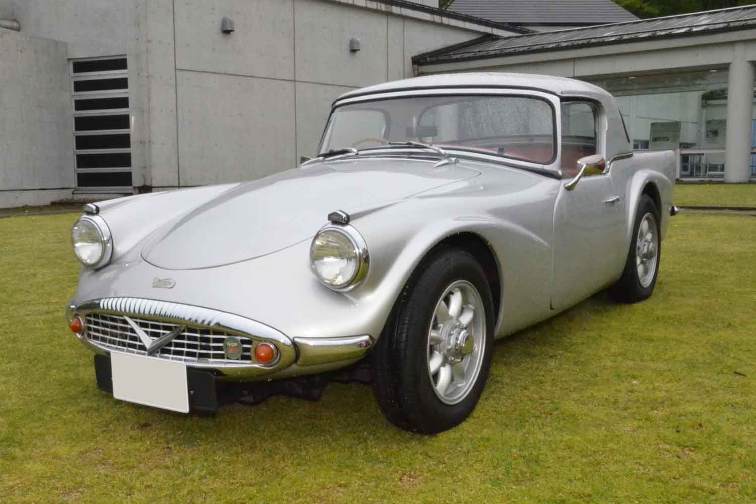 前日までの悪天候から一転、絶好のイベント日和となった5月3日のミーティング当日。会場には約50台のヒストリックカーが展示されたが、なかでもひと際目を引いたのが英国生まれの個性的なスポーツカー、ディムラー SP250だ。