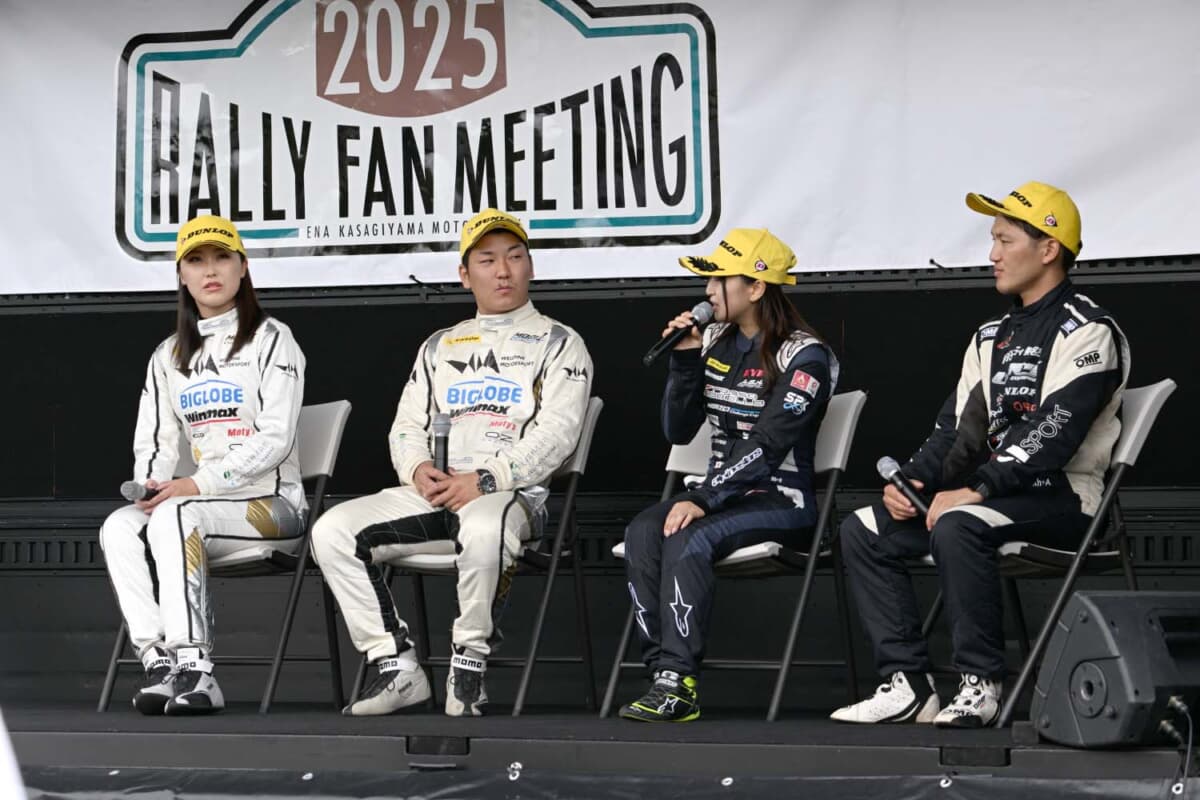 午後のトークショーでは全日本ラリー選手権JN-2クラスに参戦中の若手ドライバーが登壇。地元の三枝聖弥選手、同じ岐阜県出身の兼松由奈選手、そしてウェルパインモータースポーツの長尾綱也選手と及川紗利亜選手が、ラリー競技参戦のきっかけなどのトークを展開した。