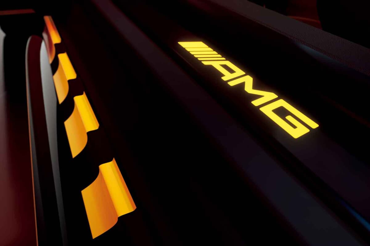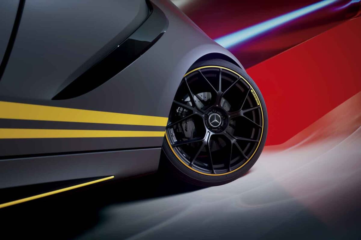 フロントエプロンにブラック基調のトリムストリップとイエローアクセントを加え、ラジエータグリルはダーククローム仕上げに変更。サイドビューには大きなイエローデカールとリム部分にイエローを配した20インチ鍛造AMGアルミホイールを装備することで、スポーティかつ統一感あるスタイリングを実現。リアにはブラック仕上げのトリムやテールパイプ、ダーククローム仕上げのバッジ、そしてAMGカーボンファイバースポイラーリップを採用し、精悍で引き締まった印象だ。