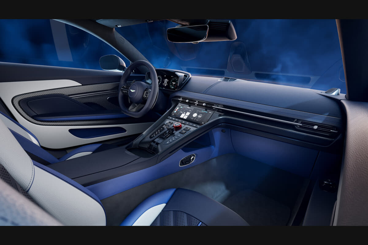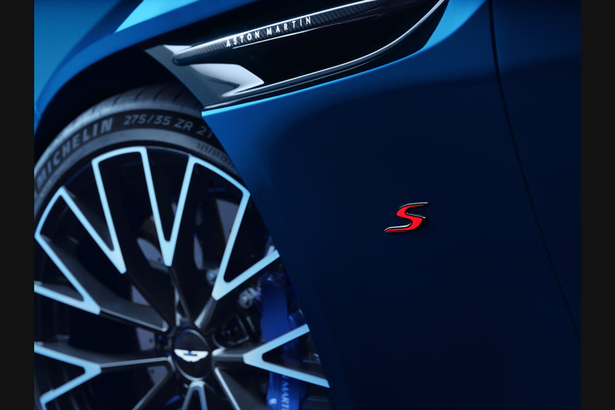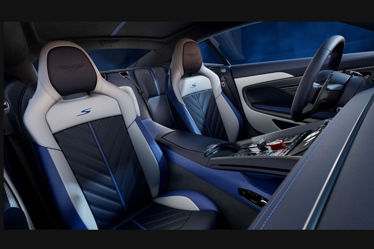 インテリアは、S専用の素材とカラーコーディネーションで仕立てられている。モノトーン、デュオトーン、トライトーンから選べる内装は、フルセミアニリンレザーまたはSレザーとアルカンターラの組み合わせが可能となる。特徴的な赤のアノダイズド仕上げのドライブモード用ロータリーダイヤルが、Sシリーズであることを象徴する。そしてヘッドレストには、業界初のエンボス&デボス加工による立体的なアストンマーティン・ウィングが施され、クラフトマンシップが際立つ。