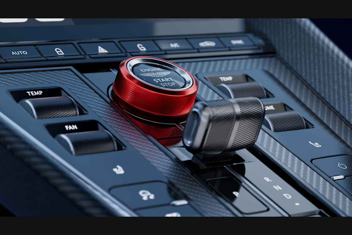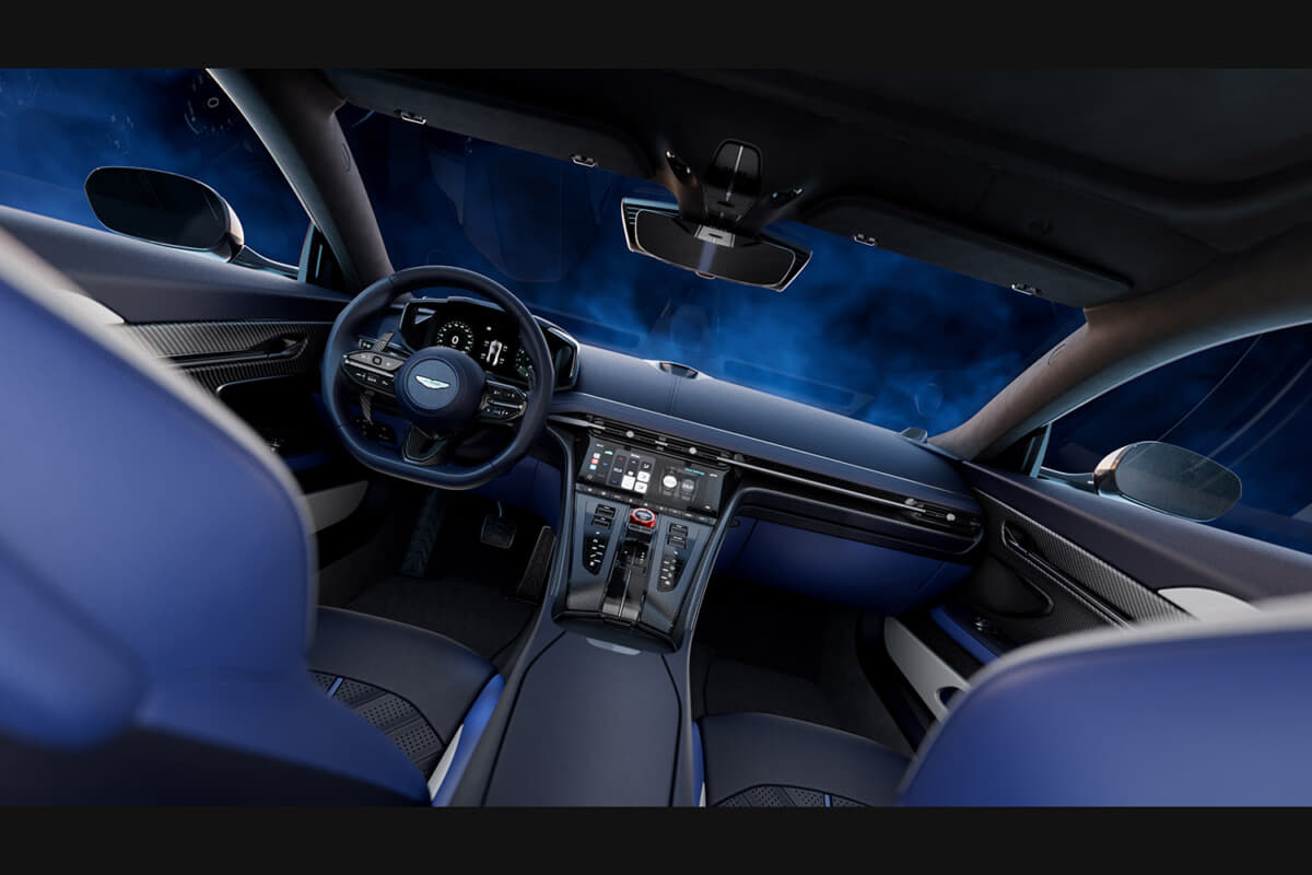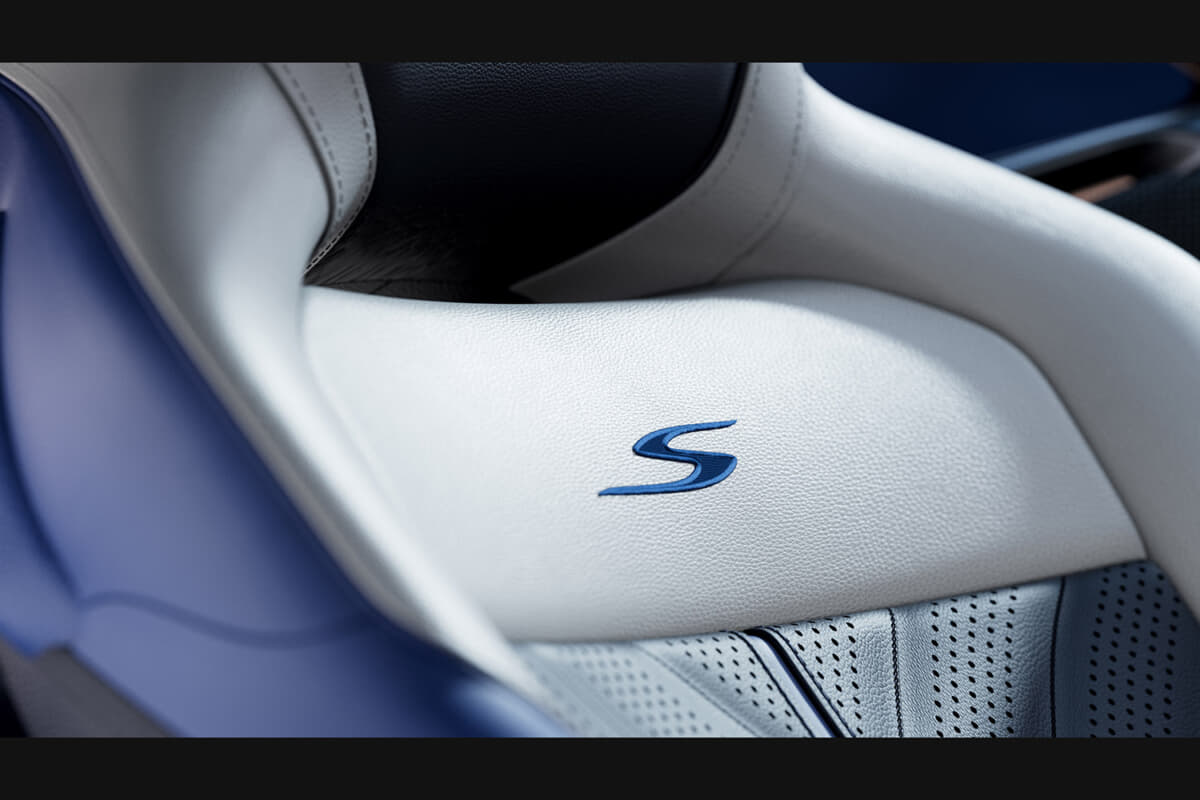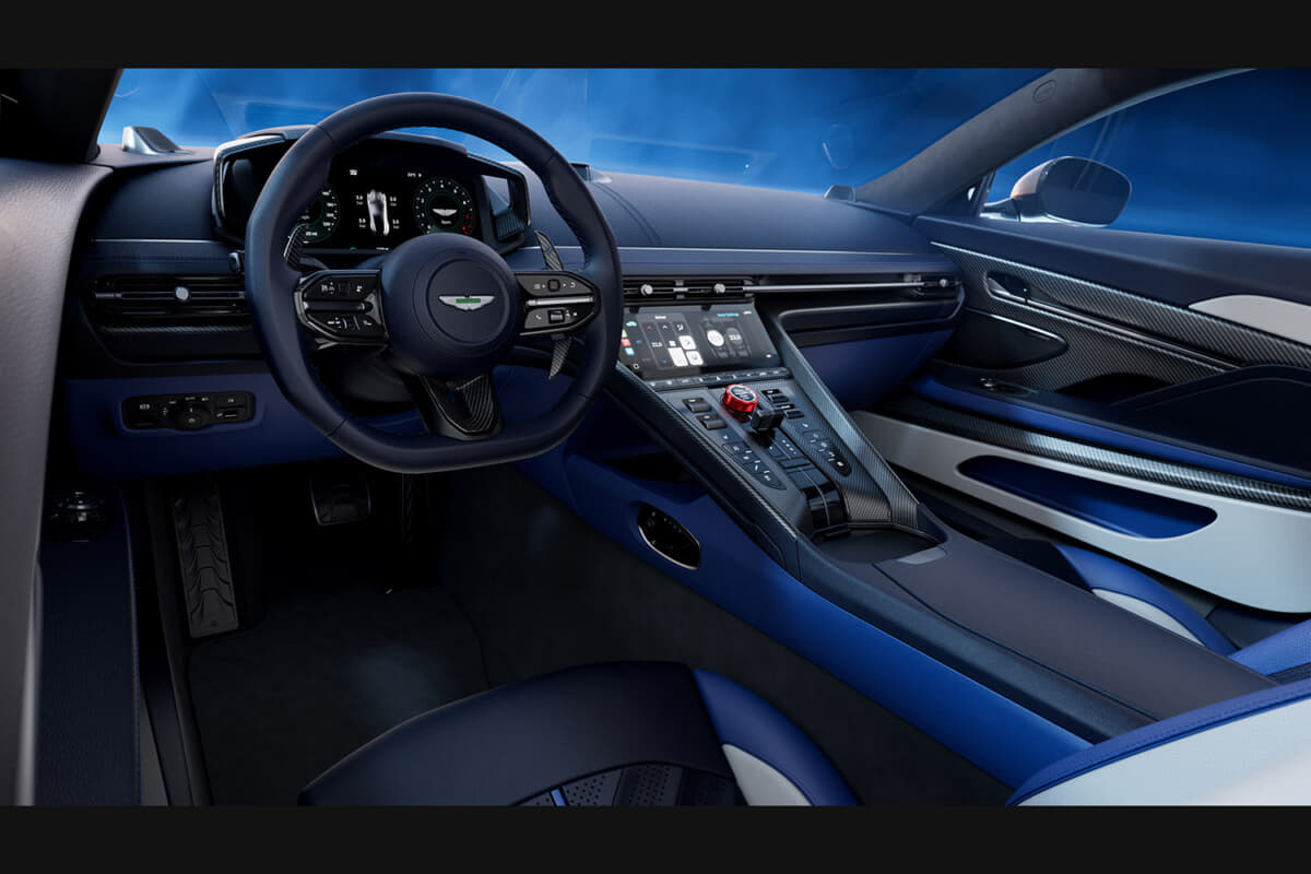 インテリアは、S専用の素材とカラーコーディネーションで仕立てられている。モノトーン、デュオトーン、トライトーンから選べる内装は、フルセミアニリンレザーまたはSレザーとアルカンターラの組み合わせが可能となる。特徴的な赤のアノダイズド仕上げのドライブモード用ロータリーダイヤルが、Sシリーズであることを象徴する。そしてヘッドレストには、業界初のエンボス&デボス加工による立体的なアストンマーティン・ウィングが施され、クラフトマンシップが際立つ。