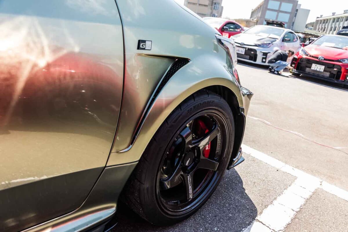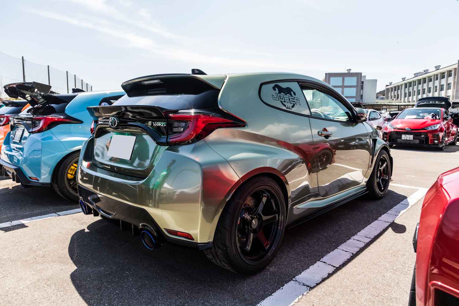 ラッピングを施した車両が並ぶエリアには、カラフルなボディカラーのGRヤリスが並んでいたが、そんななかでもとくに気になったのが、淡いグリーンでラッピングされた1台だ。ボディには派手なエアロパーツは備わっていないものの、やはりボディカラーのインパクトはかなり強く、多くの車両のなかでもかなり目立っていた。そこでオーナーの“たけちゅう”さんさんにお話を伺ってみた。