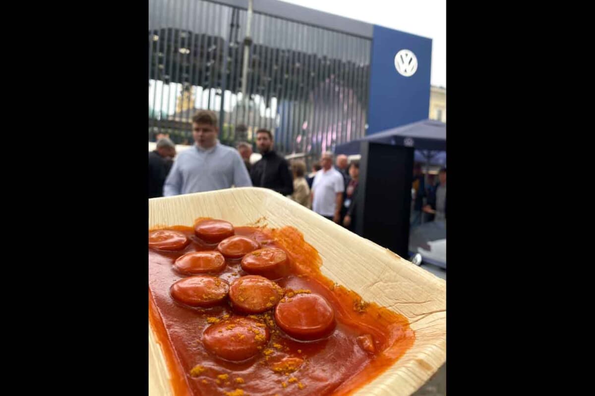 昼の時間も過ぎママチャリを押し、フォルクスワーゲン(以下VW)のブースなどを見ながらボチボチ帰ろうかな、と思っていたらとても良い匂いが漂ってきました。VWといえばカリー・ヴルスト(焼きソーセージにカレー風味のケチャップ掛け)! 私もヴォルフスブルグの本社へお邪魔した際にカフェテリアで頂いて、帰りに自分用のお土産でVW製ソーセージとケチャップを購入しました。その懐かしい味にまさかミュンヘンで再び出会えるとは!? 並んでみるとこちらも無料で頂くことができて大カンゲキ! 空いている席を探して夢中で食べていると……誰か私の名前を呼んでいる。周囲を見まわすと、ニュルブルクリンク近くに住むパパラッチフォトグラファーのシュテファンが目の前に!それも彼の手にも同じ物が……(笑)。