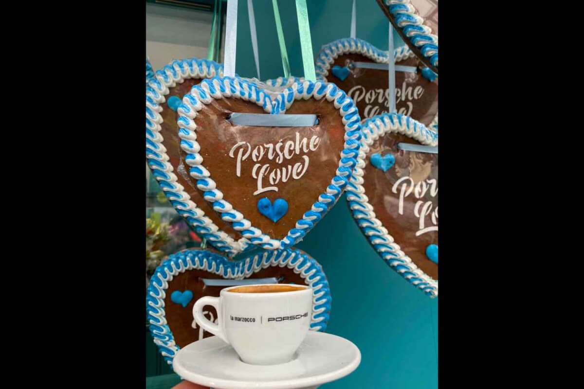 ポルシェブースのカフェでは無料でコーヒーサービスを受けることができますので、1杯のエスプレッソマキアートを頂いてちょっと休憩。オクトーバーフェストの時期を目前に控えていたこともあり『Porsche Love』と描かれた可愛らしいレープクーヘン(香辛料の入ったソフトクッキーのようなもの)の配布もあったので、列に並んでひとつ頂きました。かわいくてもったいないので、じつはまだ部屋に飾っています。