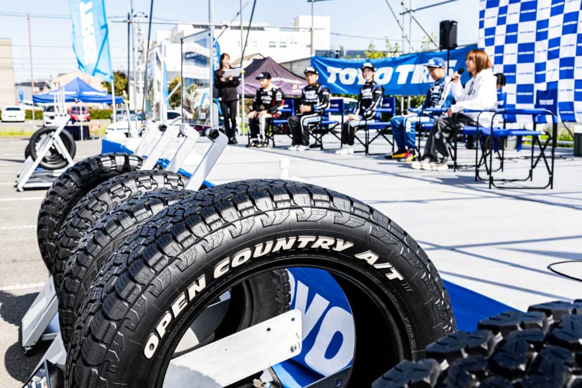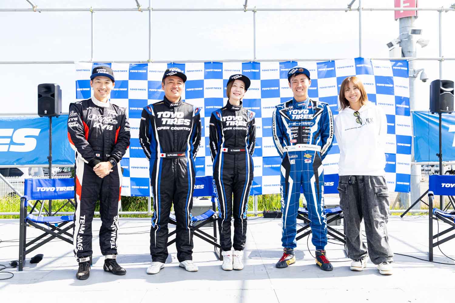 トークショーのゲストは豪華な顔ぶれ。TEAM JAOSのドライバーでTOYO TIRESブランドアンバサダーの能戸知徳さん、TEAM TOYO TIRE DRIFTのドライバーとしてD1GPおよびクロスカントリーラリーにも参戦している藤野秀之さん、玉城詩菜さん、同じくTEAM TOYO TIRE DRIFTのドライバーである松山北斗さん、マルチアングラーとして活躍しオプカン女子でもある一木花漣さん、TOYO TIRES社員でグランツーリスモの世界チャンピオンを3度獲得し、社員ドライバーとしても活躍する宮園拓真さんが登壇した。来場者はそれぞれのエピソードに聞き入っていた。
