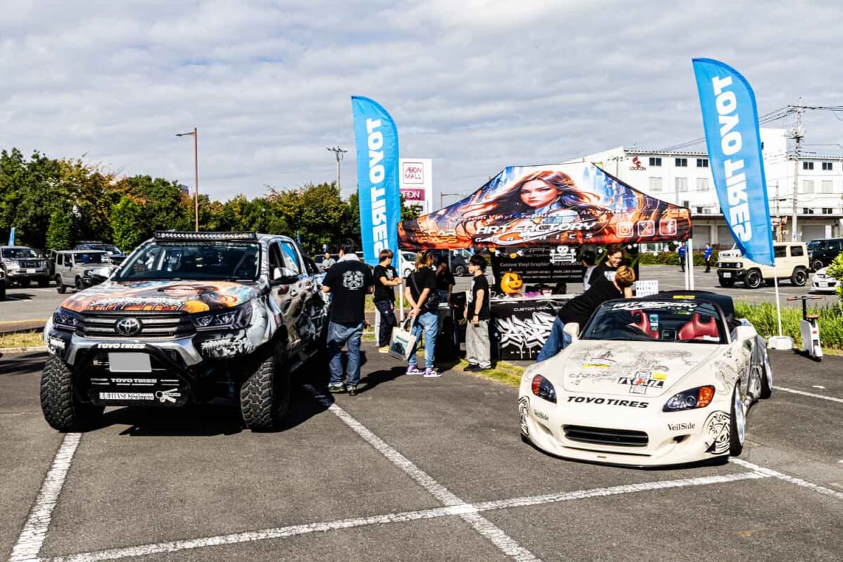 カーミーティングというと、駐車場などにクルマ好きが集まって愛車談義を行う場というイメージがある。しかし、それだけではないのがTTFMの特徴だ。会場にはTOYO TIRESをはじめショップなどのブースが並び、競技車両やデモカーが展示された。