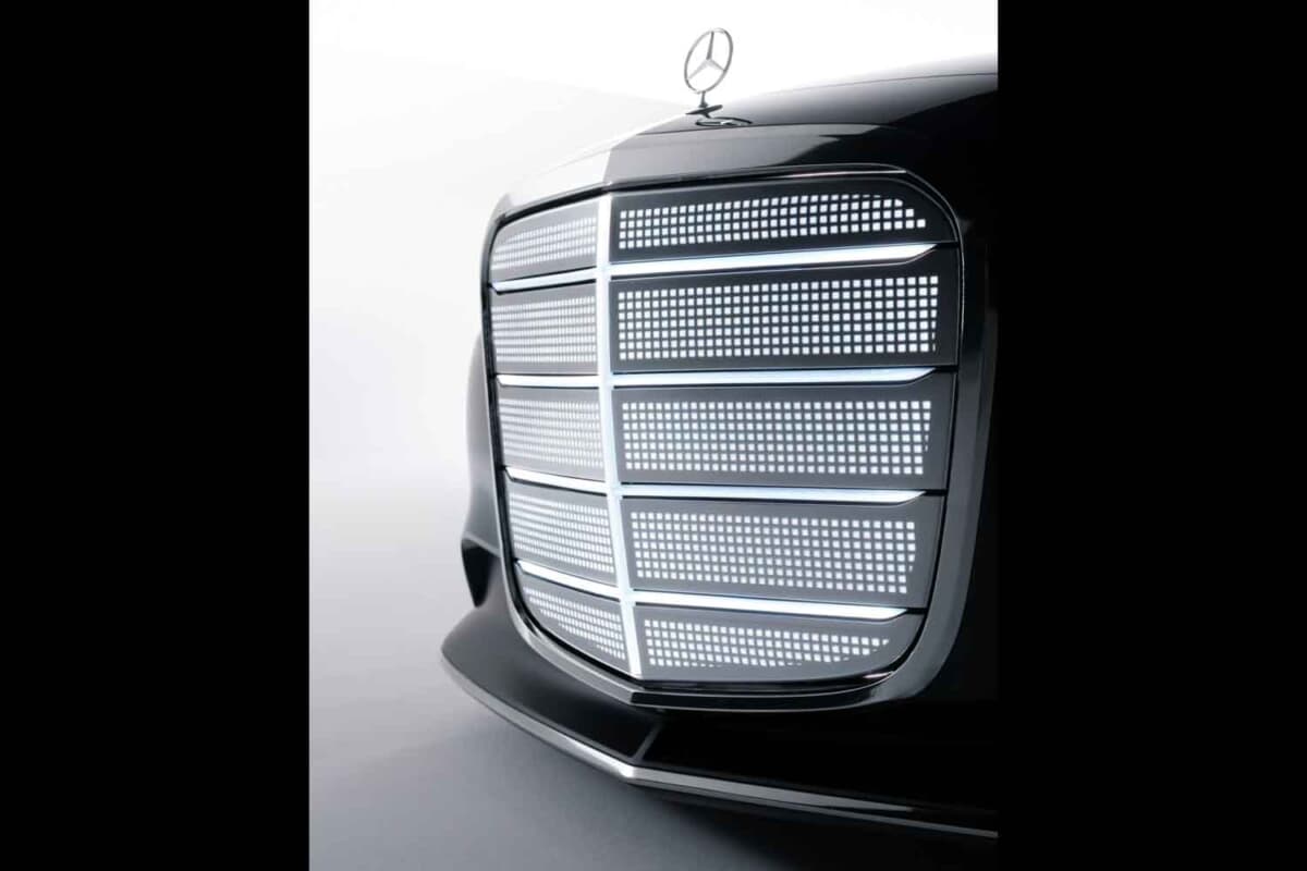 デザインの中心となるのはアイコニックグリルで、100年以上にわたりメルセデスの顔として親しまれてきた象徴的モチーフを、電動化時代にふさわしく見直した。W108やW111、そして600プルマンといった名車の直立型グリルを現代的に解釈し、スモークガラス構造とクロームフレームを採用。周囲には輪郭照明を埋め込み、グリル全体が光の演出によって表情を変え、ボンネット上のスリーポインテッド・スターも発光し、静止していても“息づくような存在感”を放つ。これはメルセデスのデザイン言語が、金属から光へと進化した象徴といえる。