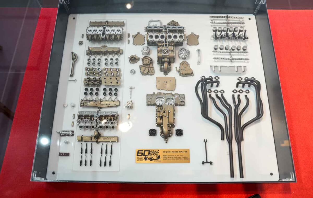 1基目は、今回メキシコGPで走行したRA272に搭載され、ホンダF1初優勝を支えた1.5L V型12気筒自然吸気エンジン「RA272E」だ。