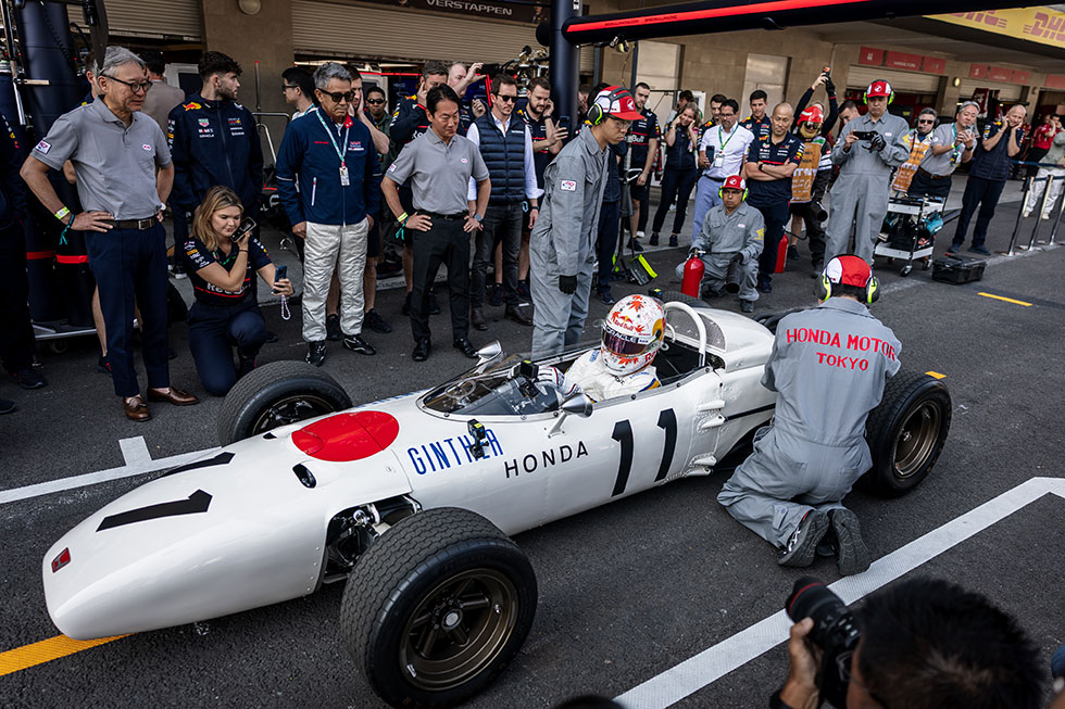 ピットレーンには白地に日の丸をあしらったマシンが姿を現し、当時のメカニックをオマージュしたつなぎを身にまとったスタッフが周囲を固めた。まるで1965年当時の光景がよみがえったような雰囲気が漂い、節目のイベントに華を添えた。
