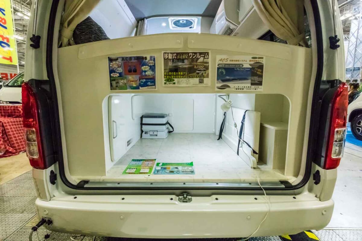 そのなかで注目したのは、ホワイト基調の明るい内装が目立っていたRV BIGFOOTのACSリトルノオクタービアMである。30年の歴史を誇る老舗キャンピングカーメーカーが手がけるこの最新モデルは、キャンプの際だけでなく、災害時にも役に立つACS太陽光発電システムを搭載している。