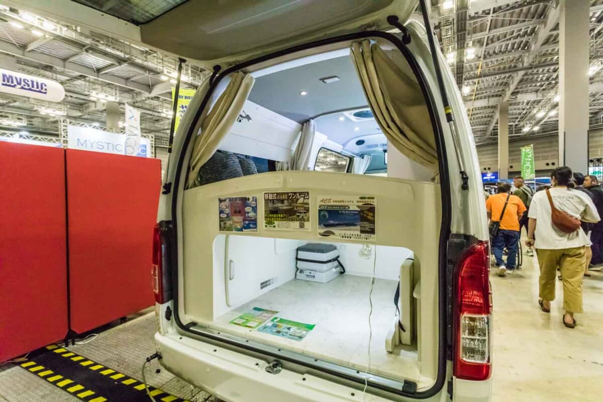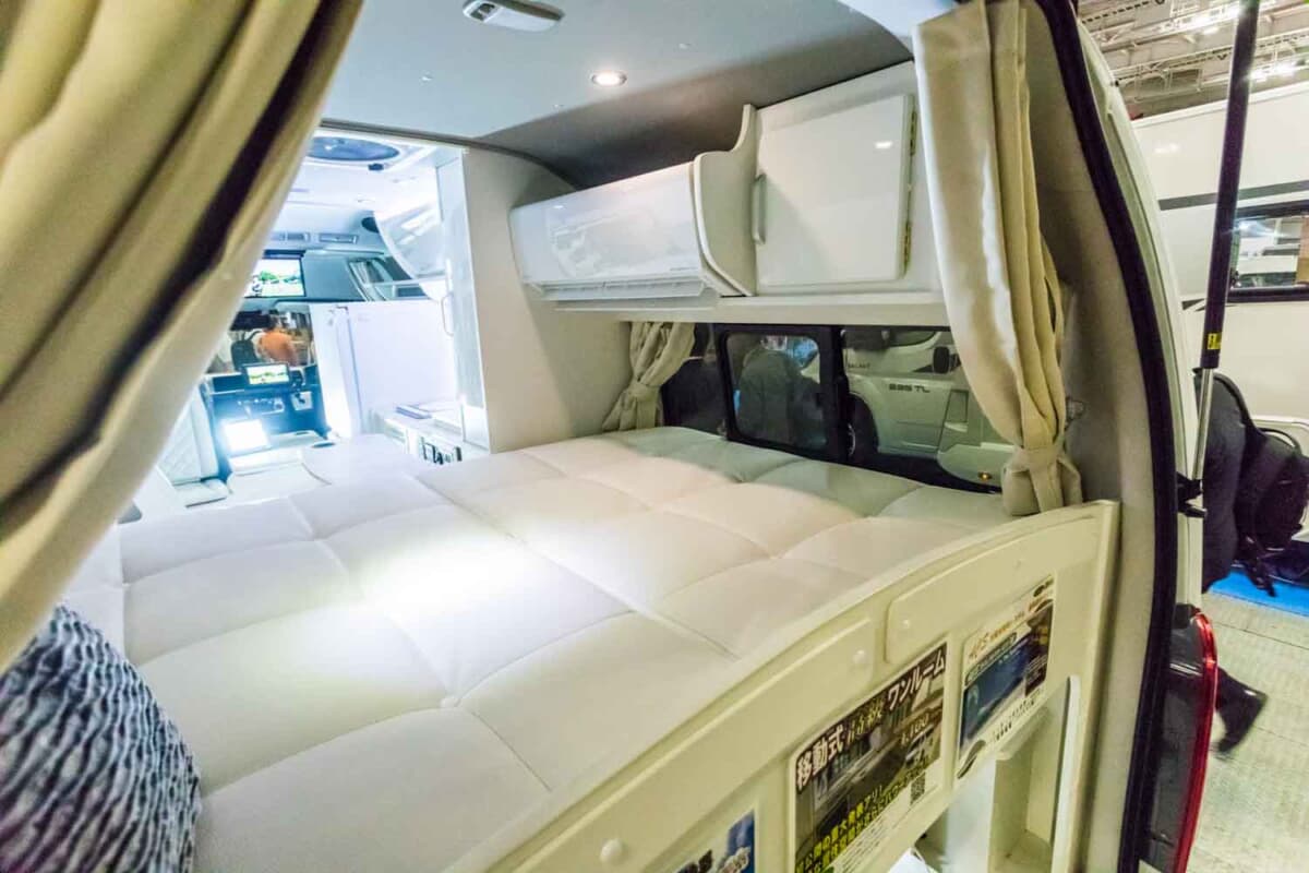 • トヨタ ハイエース:後部ベッドの高さを1mほどとすることで、その下を巨大な収納スペースとしている