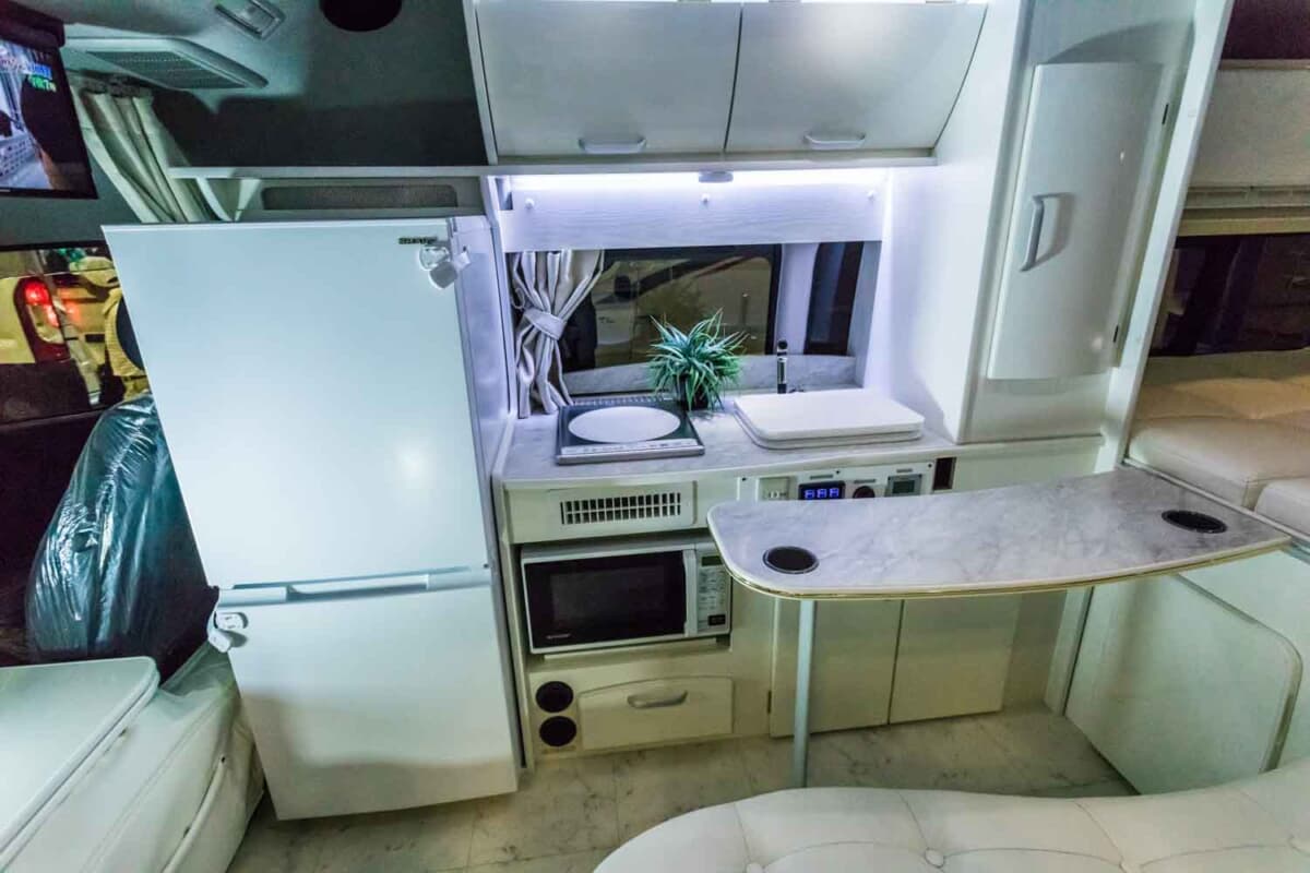 • トヨタ ハイエース:サイドのスライドドアから車内に入ると、大きな家庭用冷蔵庫、電子レンジ、IHヒーターなどの家電製品を設置した家具が目を引く