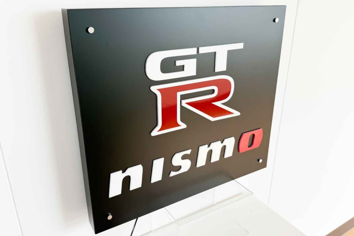 2020年にリリースされたファーストアイテムはスカイラインGT-R(BNR 32/BCNR 33/ BCNR 33 AUTECH /BNR 34)とNISMOの2タイプだ。前者は600mm×600mm(L)と300mm×300mm(S)の2サイズ。後者は800mm×240mm(L)/500mm×160mm(M)/440mm×120mm(S)の3サイズを設定している。パネル中央にレーザーカットで製作したエンブレムを配置し、文字部分をパネル面から約5mm上げることで、エッジのシャープさを強調する。さらにパネル下部に内蔵されたLEDが発光することで、エンブレム全体が浮かび上がるような立体的な光の演出を生み出している。
