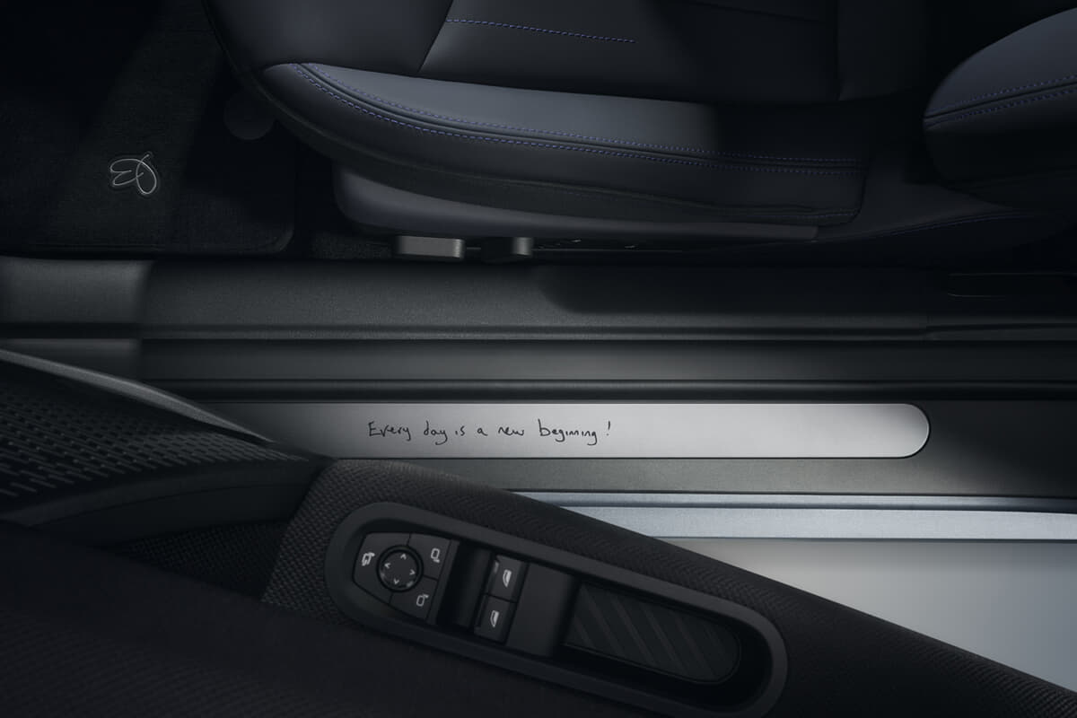 円形センター・ディスプレイでは、3種類のポール・スミス・デザインバックグラウンドから選択可能なパーソナルモードを搭載。ドアを開けると、地面に「Hello」と投影されるハンドライティング・プロジェクションが現れ、同乗者を迎える演出も新採用された。またスカッフプレートにはポール・スミスのモットーである「Every day is a new beginning(毎日が新しい始まり)」という言葉が刻まれ、フロアマットには彼が描いたウサギのモチーフがリベットとしてあしらわれている。