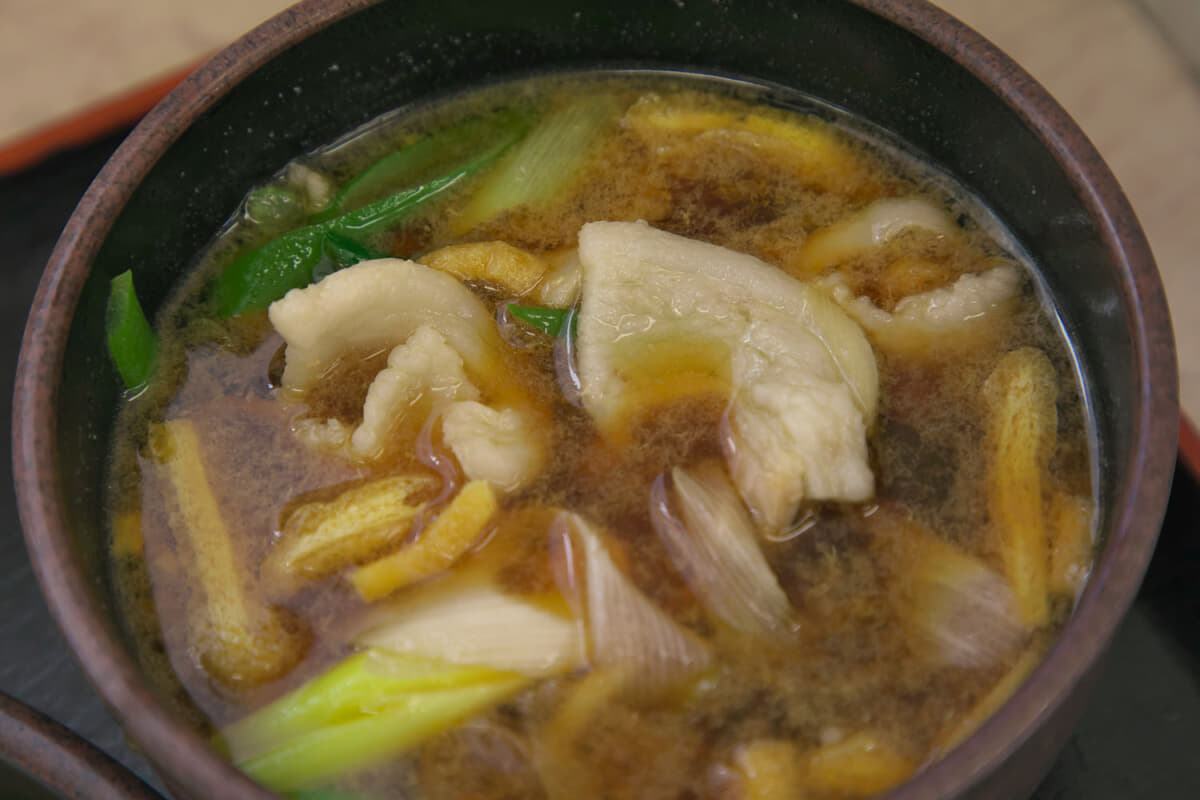 豚肉をたっぷり60g入れただし汁は、コシの強い麺に負けないよう、鰹だしを主とした濃い味で甘みを強めに出している。豚肉も脂身と赤身のバランスが良い部位を使用しており、脂身の甘みがだし汁の甘さを引き立てている。