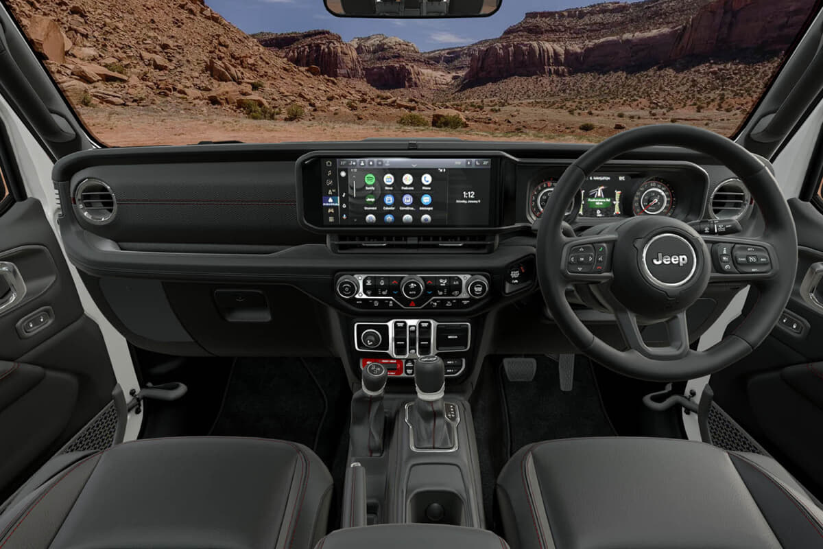 搭載されるロックトラック® フルタイム4×4システムは、4:1の低レンジギヤ比を備え、スイッチ操作により前後ディファレンシャルをロックし、4輪に均等な動力を伝達する機構を採用している。これにより、岩場や急勾配といった極めて過酷な地形においても高いトラクション性能を発揮。また、電子制御式スウェイバーディスコネクト機能により、スイッチひとつでスタビライザーを切り離し、サスペンションの可動域を最大化。悪路での接地性を飛躍的に向上させている。