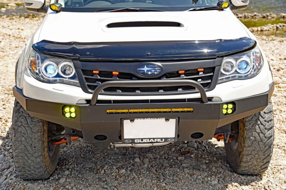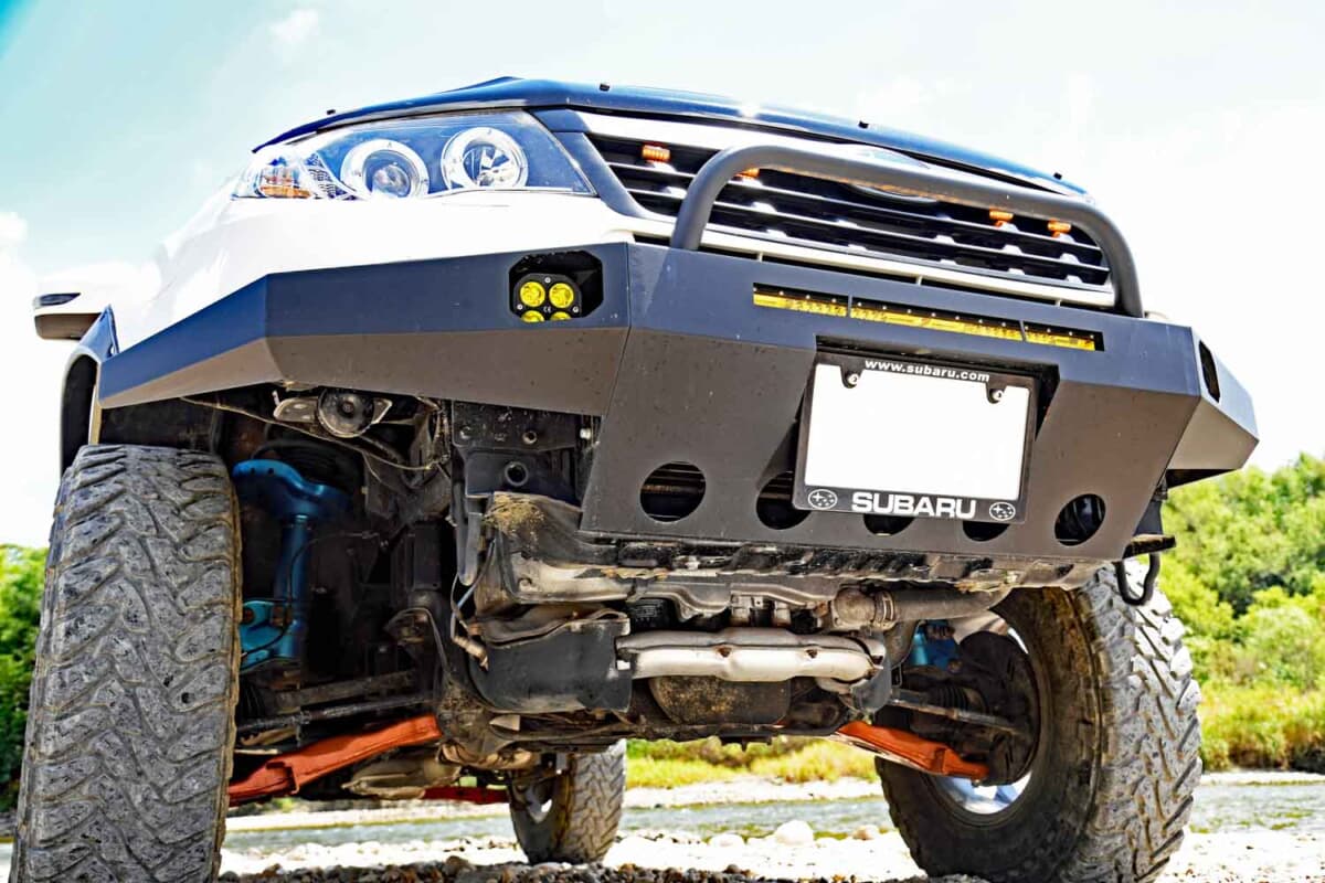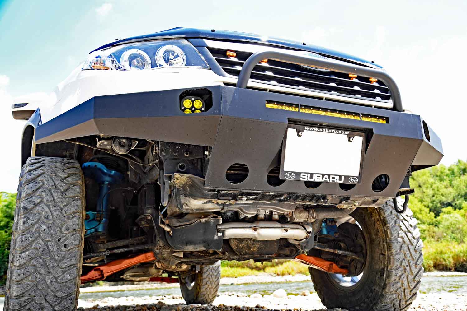 当初は車高調式のショックからノーマル車高の社外ショックに交換し、ノーマルスプリングと組み合わせて1年ほど乗っていた。その間にSNSなどでトヨタ「タコマ」や「4ランナー」をオーバーランド仕様にカスタムしているのを見て触発された。より大径のM/T(マッドテレーン)タイヤを履けるフォレスターを作るべく、さらなるハイリフト化に着手した。が、3センチほどのアップではオーバーランドサイズのタイヤは履けない。そこで、ハイリフト化と並行し、ご自身の職場でもある実家の鉄工所にて、まずはフロントのアイアンバンパー制作に着手した。