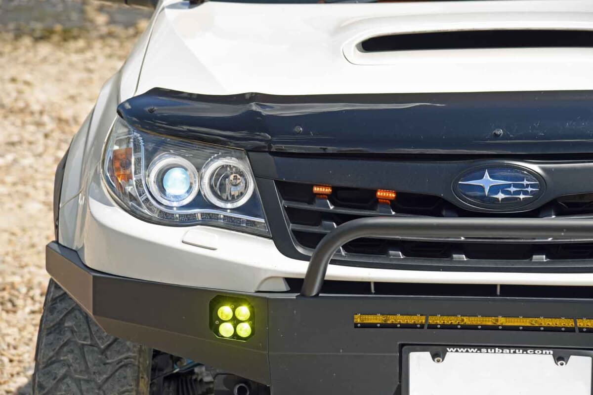 • スバル フォレスター:グリル前のU字のガードバーは、制作したバンパーにボルトで固定するタイプボンネット前のバグガードは、ネット通販で購入した