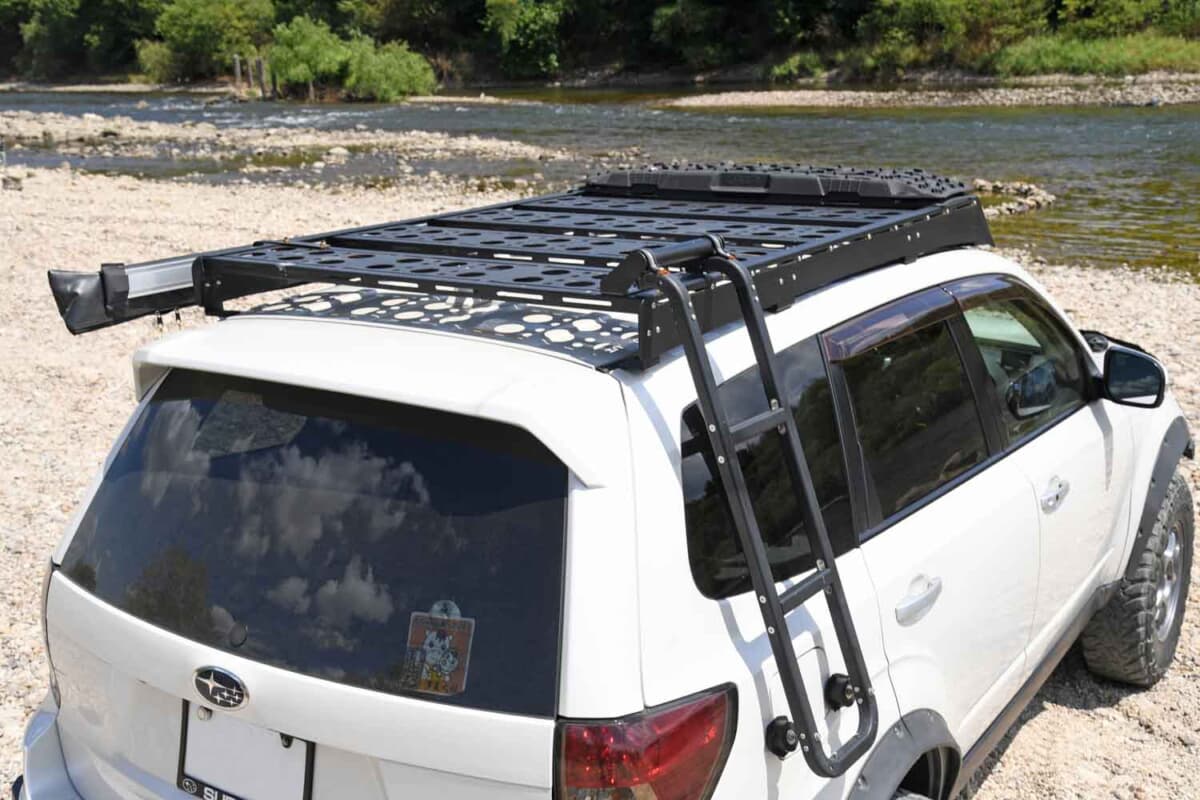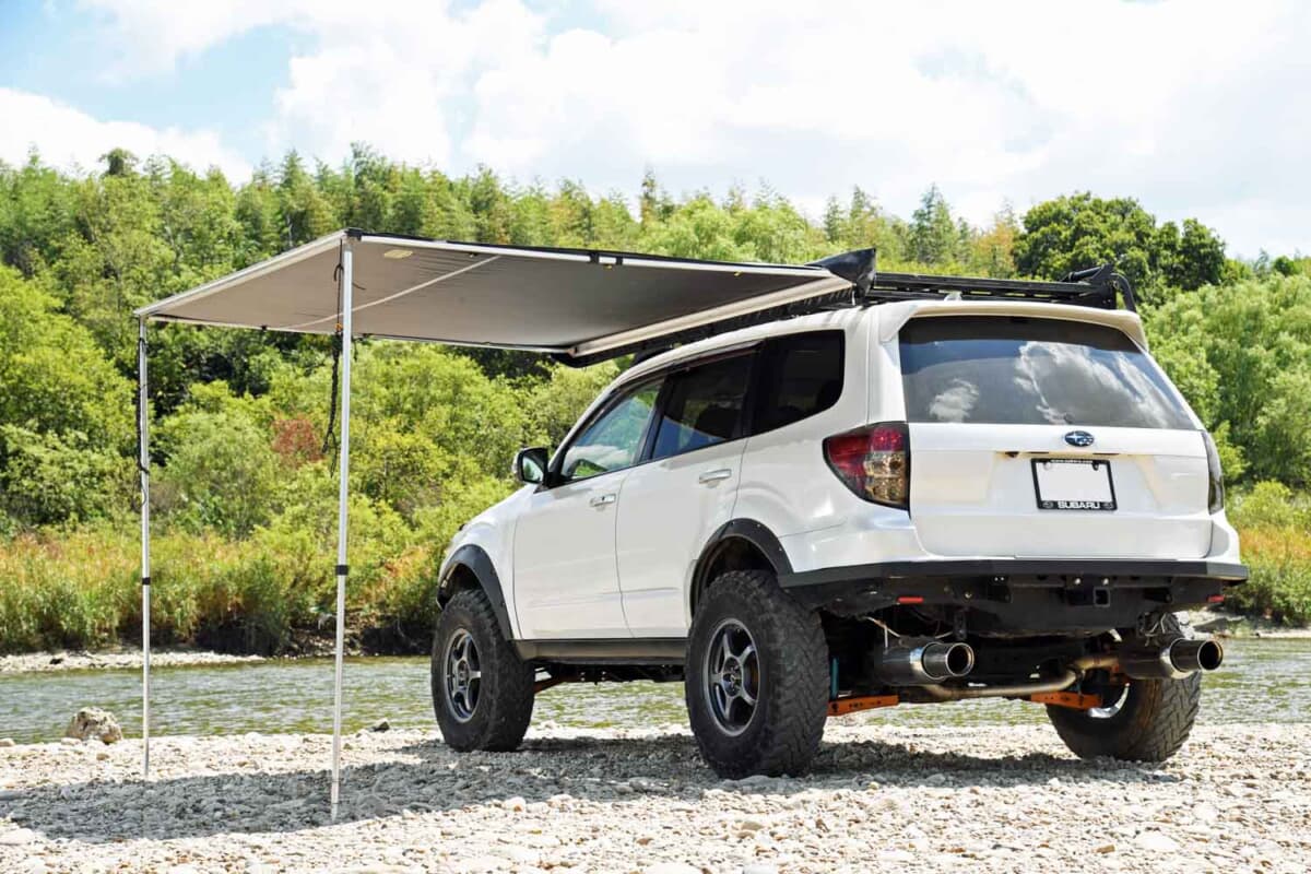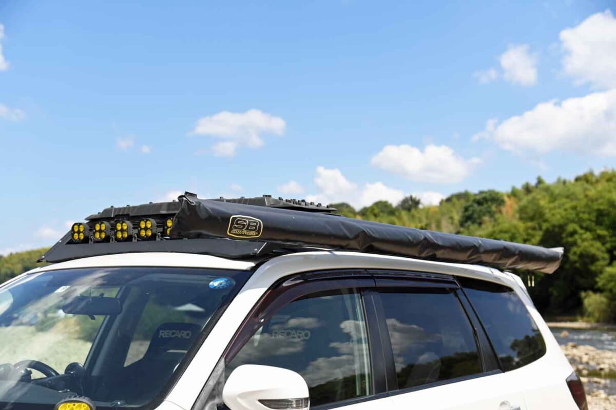 • スバル フォレスター:ルーフラックのサイドにサイドオーニングを取り付けている