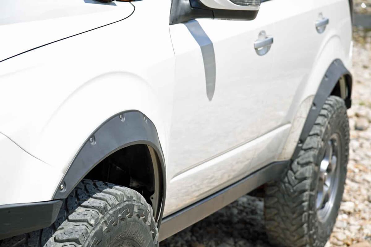 • スバル フォレスター:前後のバンパーの黒を繋ぐコーディネーションを考えた。真っ白なボディサイドに黒のポイントを入れたかったため、50mmオーバーフェンダーを装着している。それに合わせて、ツラ合わせの50mmスペーサーを装着
