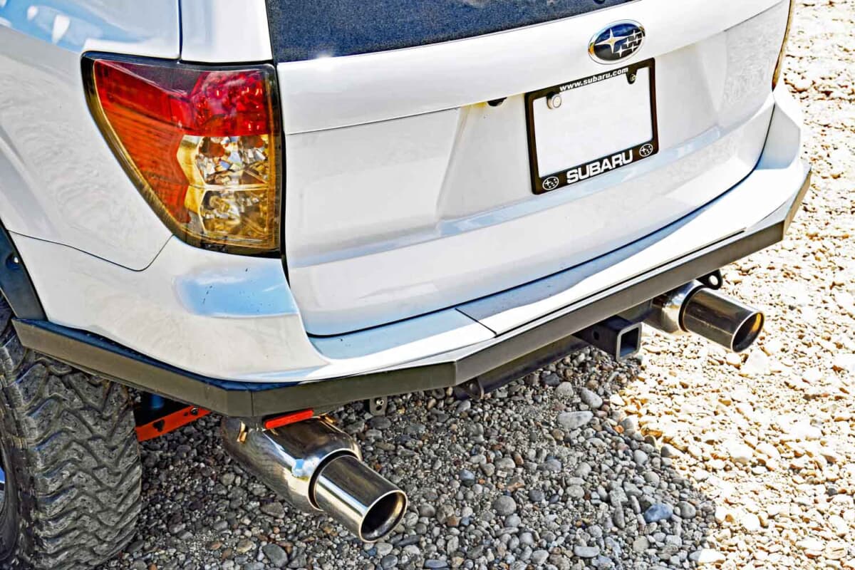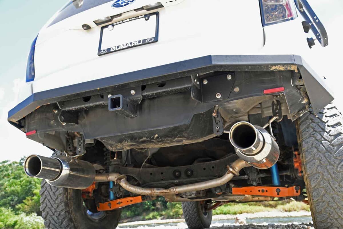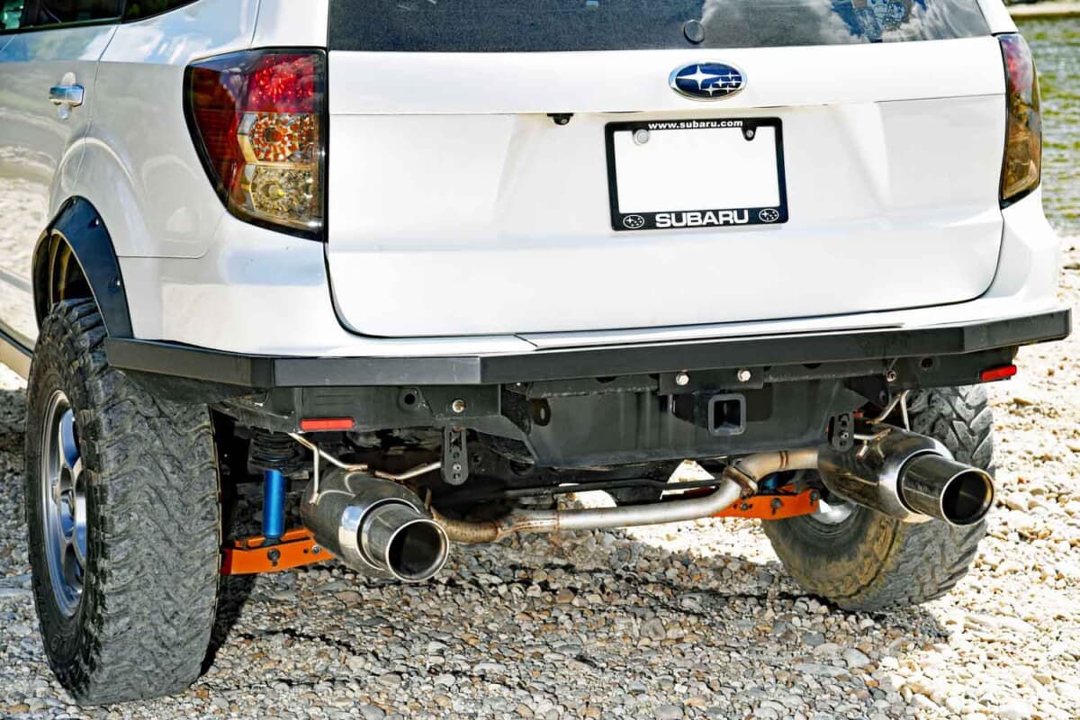 • スバル フォレスター:マフラーはリアのパートのみHKS製のデュアル出し。取り付け位置もマウントで高さを調整している。オレンジ色のリアのロアアームはインプレッサ用の社外品だ