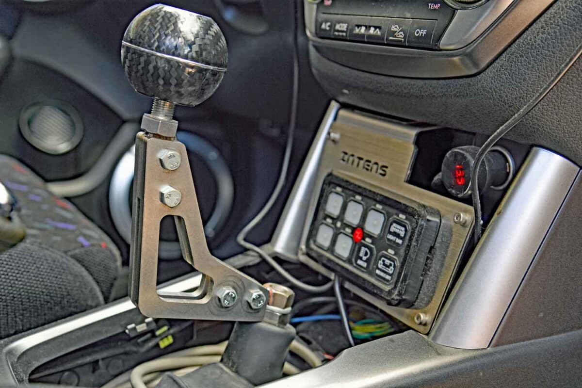 • スバル フォレスター:一見するとドグミッション風にも見える、オリジナルの延長シフトレバーとノブ。コンソールのスイッチボックスはLED補助灯のスイッチだ。周りの金属プレートも自作している