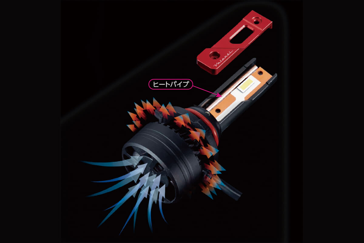 また、新搭載のヒートパイプとLED基盤は熱伝導性の高い銅をセレクト。さらに、本体は熱伝導性の高いアルミを使用してヒートシンクまでを一体構造。電動ファンを内臓することで、熱を確実に放出させ、安定した明るさを維持させる。