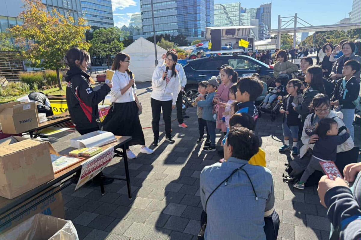 お天気はまずまず、といったところ。場所は「花の広場」という国際展示場駅のロータリーを挟んだ向かい側で、人が来てくださるか少し心配でしたけれど……。周囲にはJAFや首都高速道路公団、NEXCO東日本、自衛隊の皆さまもいらして、小さなお子さま連れを中心にたくさんの方がご参加くださったのです。おかげさまで大盛況でしたわ。