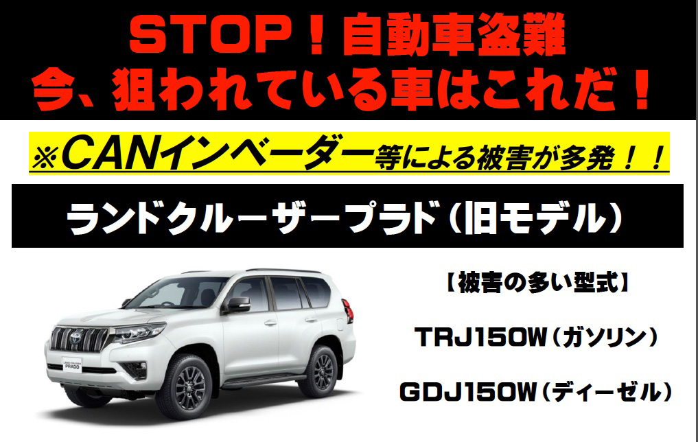 2025年9月、警察庁は“STOP! 自動車盗難・今、狙われている車はこれだ!”を発表。盗難件数が増えている車種としてトヨタ150系ランドクルーザープラドの車名を挙げて所有しているユーザーに警鐘を鳴らした。