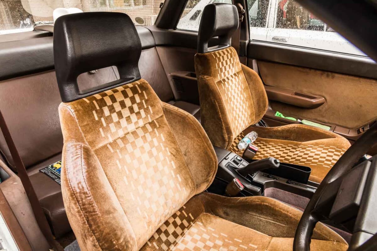大場さんの1985年式VRターボは、基本的にオリジナルペイントでオリジナルインテリアという状態の良い個体だ。足まわりは純正のエアサスペンションの不具合により、バネサスに変更している。フロントのバンパーのみ大場さんの好みで後期モデル用に交換。さらに普段は14インチアルミを履いているそうだが、イベント時のみ純正の13インチスチールホイールと、今となっては貴重な格子柄ホイールキャップを装着している。