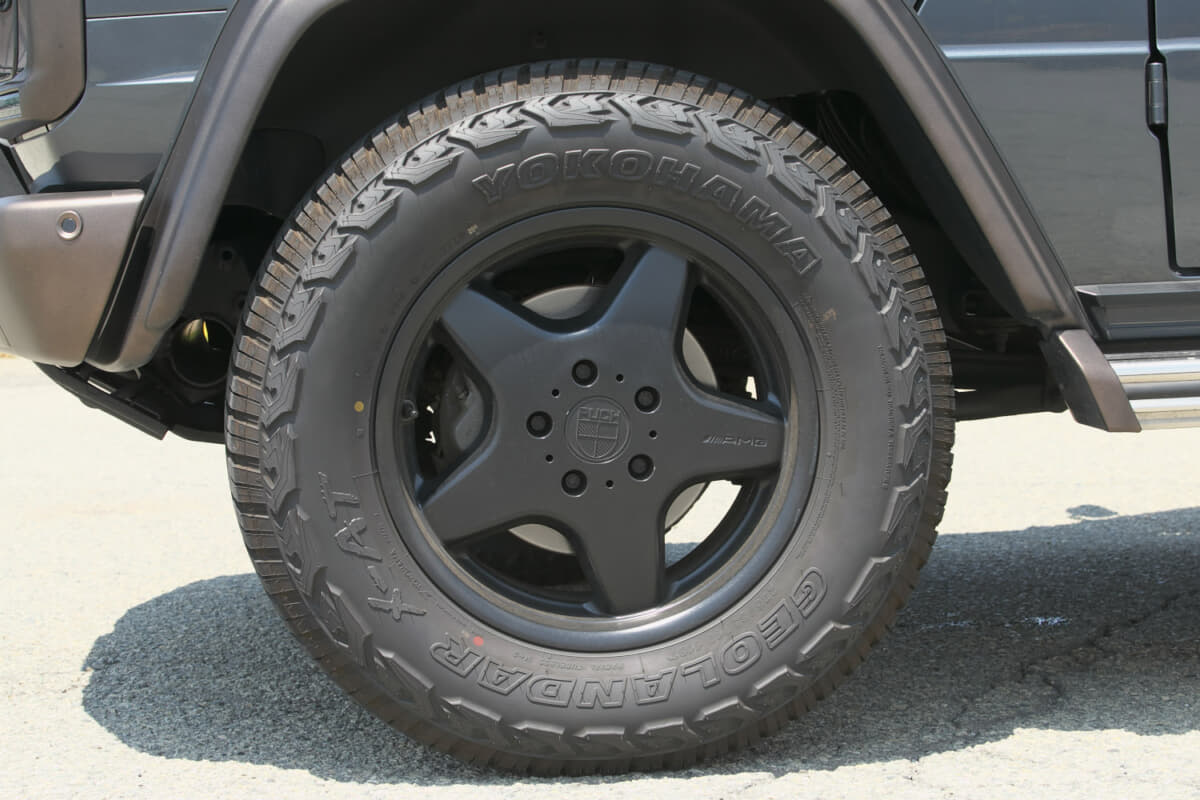 「ボディカラーは純正テノライトグレー+オリジナルマットブロンズツートーンで、ホイールはAMG G36用をマットブラック塗装しています。さらにオーバーフェンダーAMG G36用ラバーフェンダーオマージュ仕様をワンオフで製作しました。ラダーは本国から取り寄せ、スペアタイヤは取り外し、ナットを武骨に付けてワイルド感をアピールしています。マフラーもワイルドさを出すために、ボディーショップキクタワンオフスラッシュマットブラックに塗装しました。インテリアは、ステアリングエンブレムは手に入らなかったので後期ステアリングに合わせてワンオフ製作してもらいました。自称レストモッド仕様と言うべきでしょうか、派手さは無いですが、渋い味のある唯一無二のクルマに仕上がったと思います」