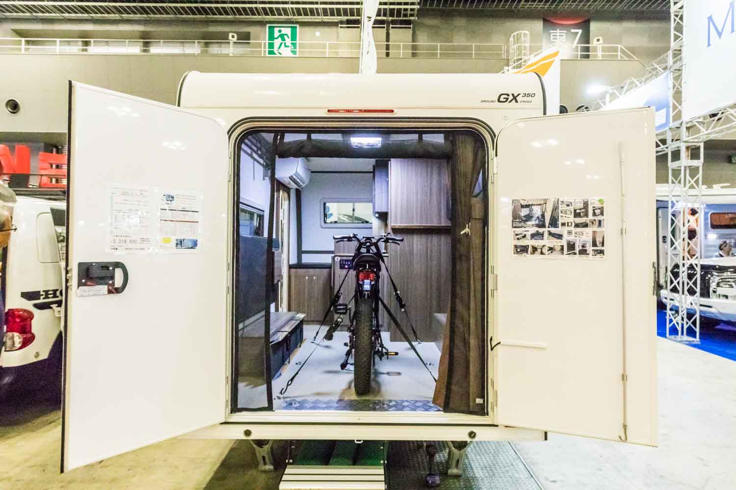 ここ最近、各地のキャンピングカーショーでにわかに注目を集めているのが、キャンピングトレーラーである。もちろん昔から存在しているが、ここ数年はさまざまなスタイルや形状のトレーラーが増えている。今回紹介するのは、後部にハッチを備えることで、バイクなどを格納することができるタコス GX350というキャンピングトレーラーだ。