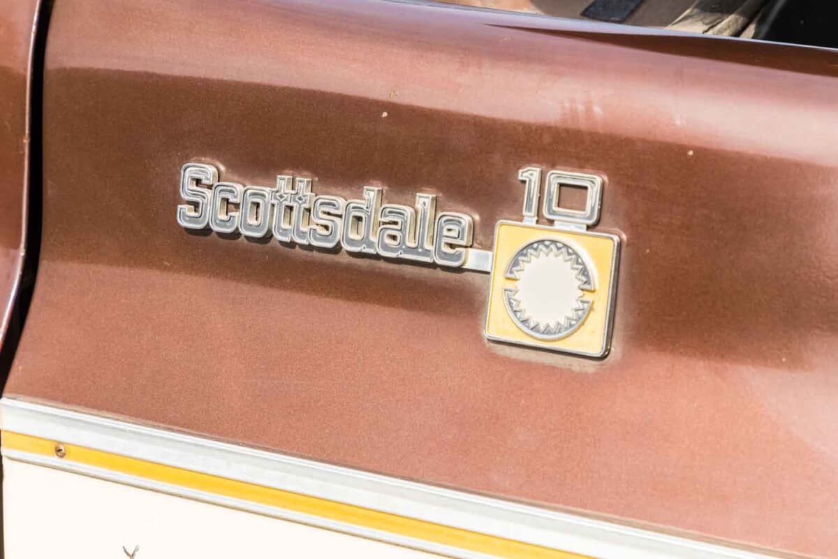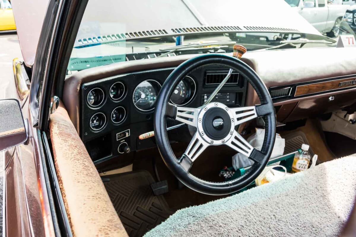会場のなかでも数多くのアメリカ車が並ぶエリアで発見したシボレーのC10ピックアップは、ややヤレているがオリジナルペイントと思われるクリームとブラウンという渋い純正ツートンカラーをまとっていた。ボディ各部のエンブレムやモール類もしっかりと残っているだけではなく、ボディモールはよく見るブラックではなく、内側がイエローという珍しいディテールを持つ。