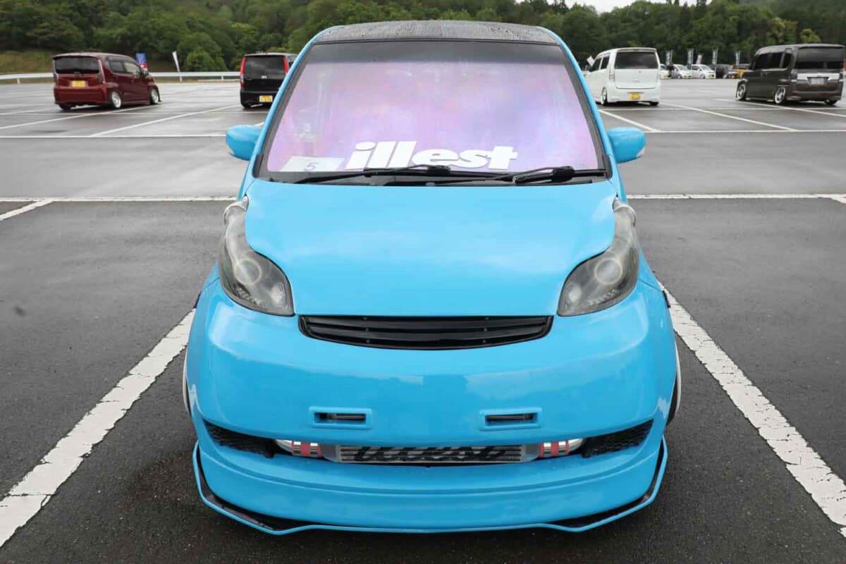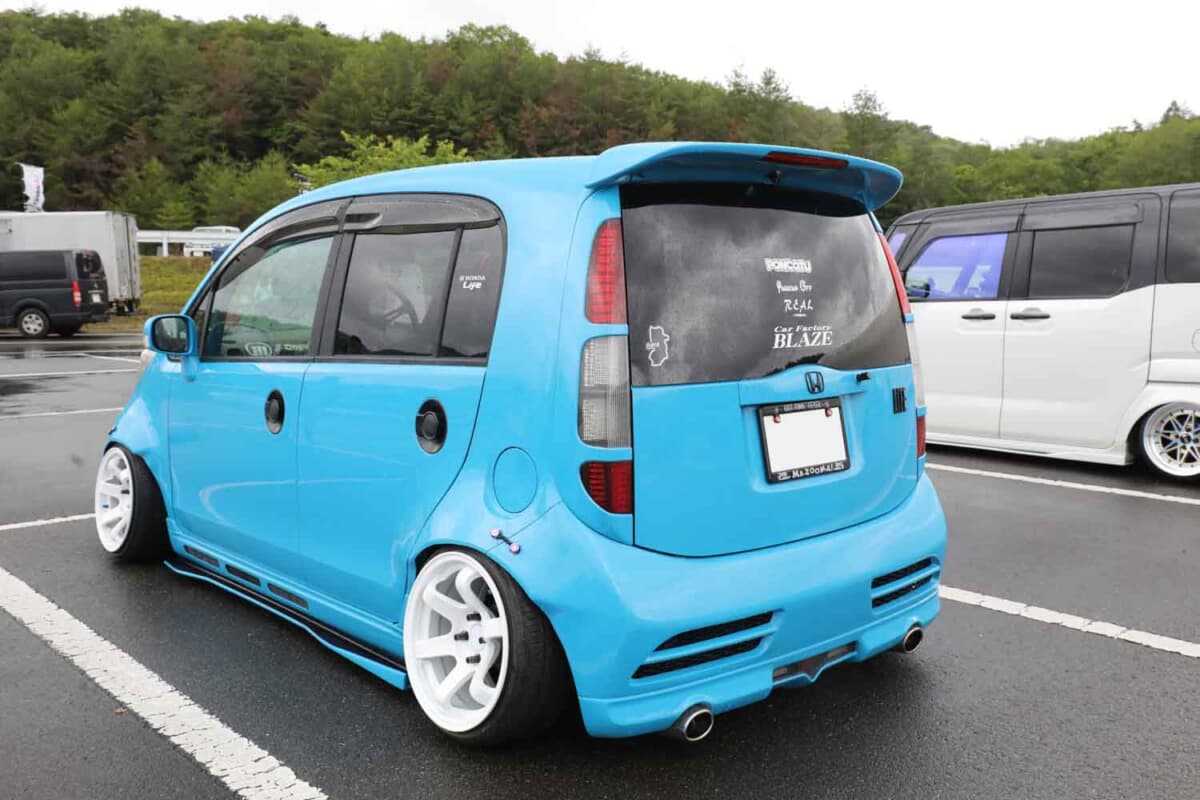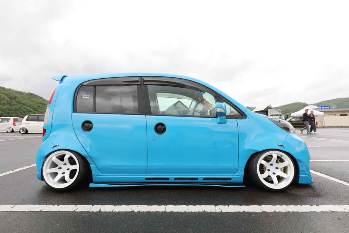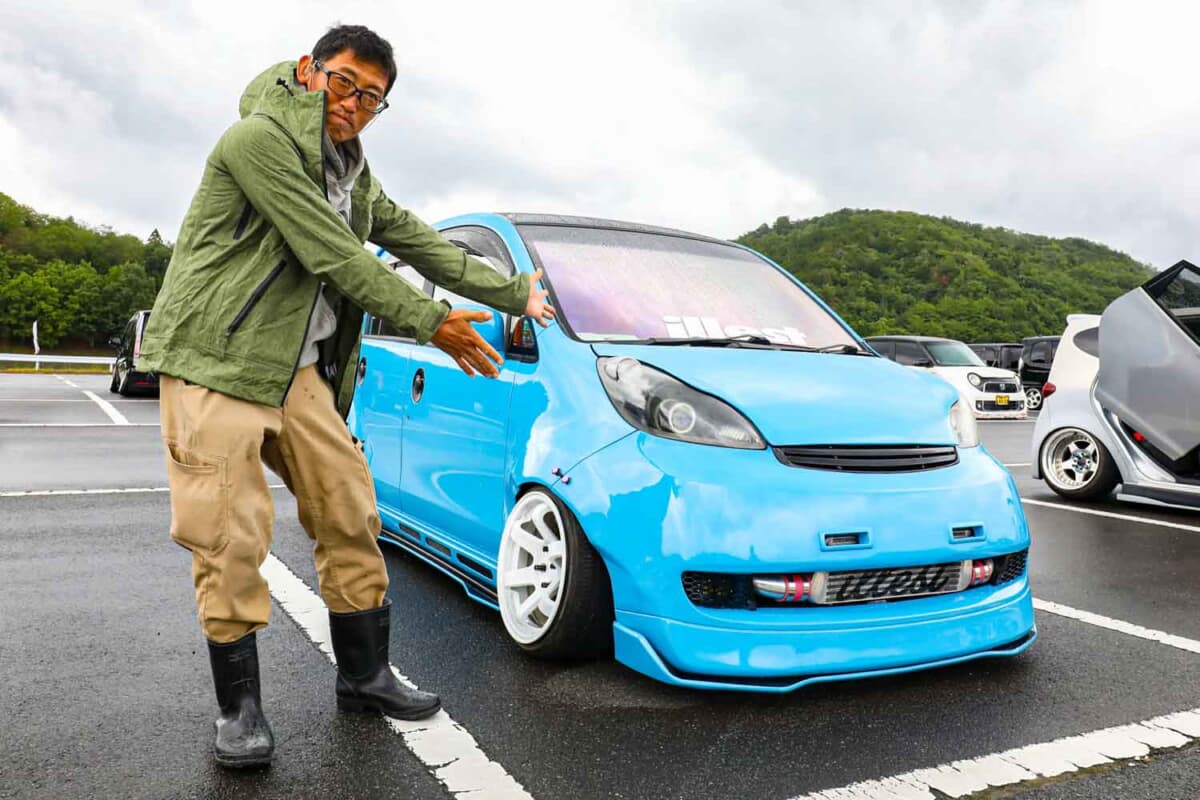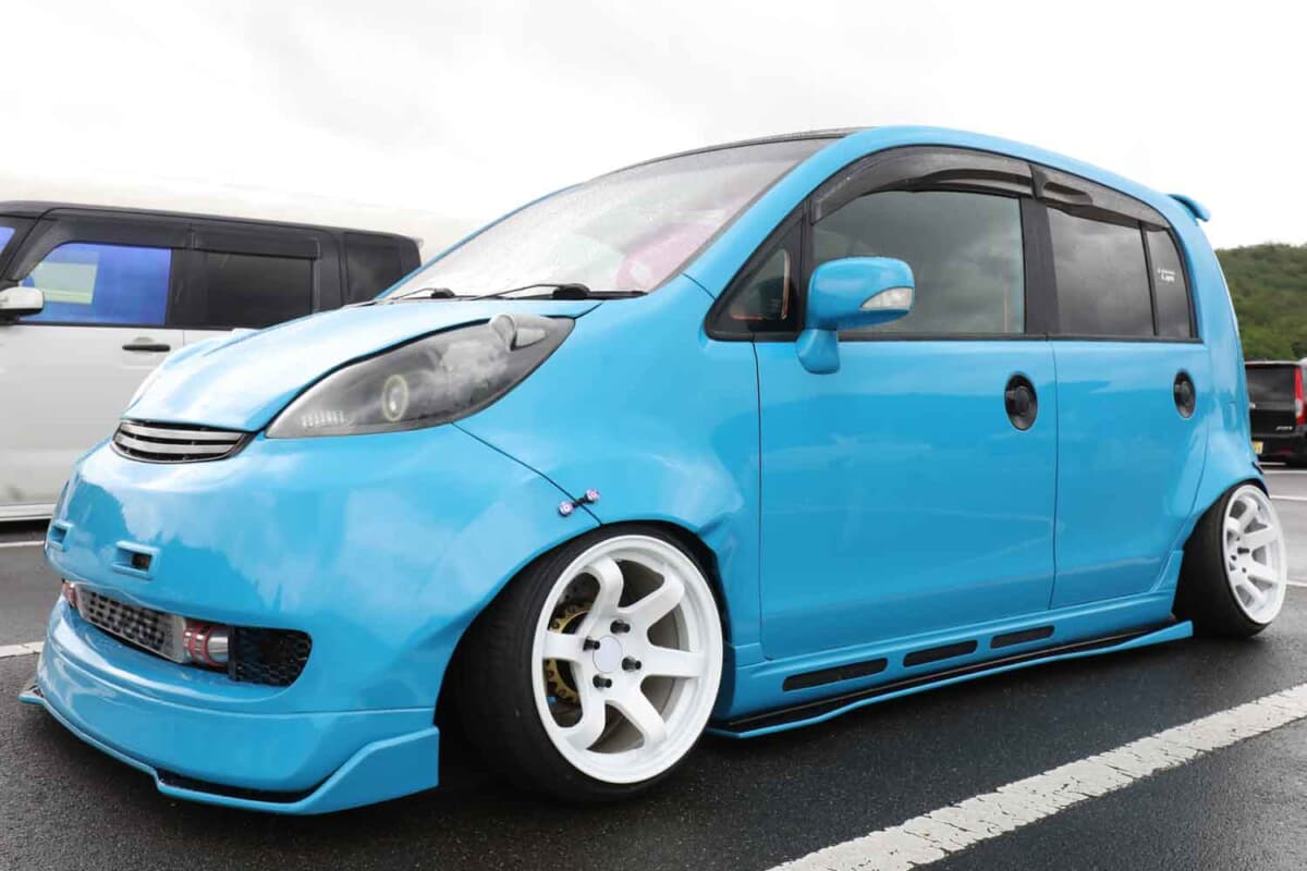 気になる仕様については、強者ひしめくカスタムカーが集うイベントにおいても見劣りしない、インパクトのある存在感を示す作り込みだ。見た瞬間にワイドボディ感が目に飛び込む。そのルックスはカッコ良さだけでなく可愛らしさもあり、チョロQ的なデザインが面白い。