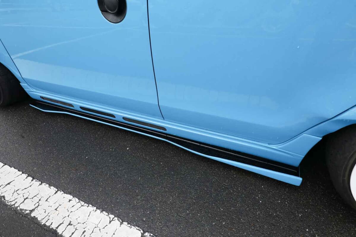 鋭い表情を作り出すヘッドライトはインナー部をプロジェクターリング仕様に組み替え、純正マスクからアレンジを加えるべくボンネットを一部延長加工してヘッドライトを覆うデザインにも注目だ。バンパーもオリジナルリメイクを施し、ニスモのダクトにカナード付きのリップスポイラーを装着している。このカナードは、サイドステップにもボディに合わせてワンオフ製作したステップ一体型として装着させた。