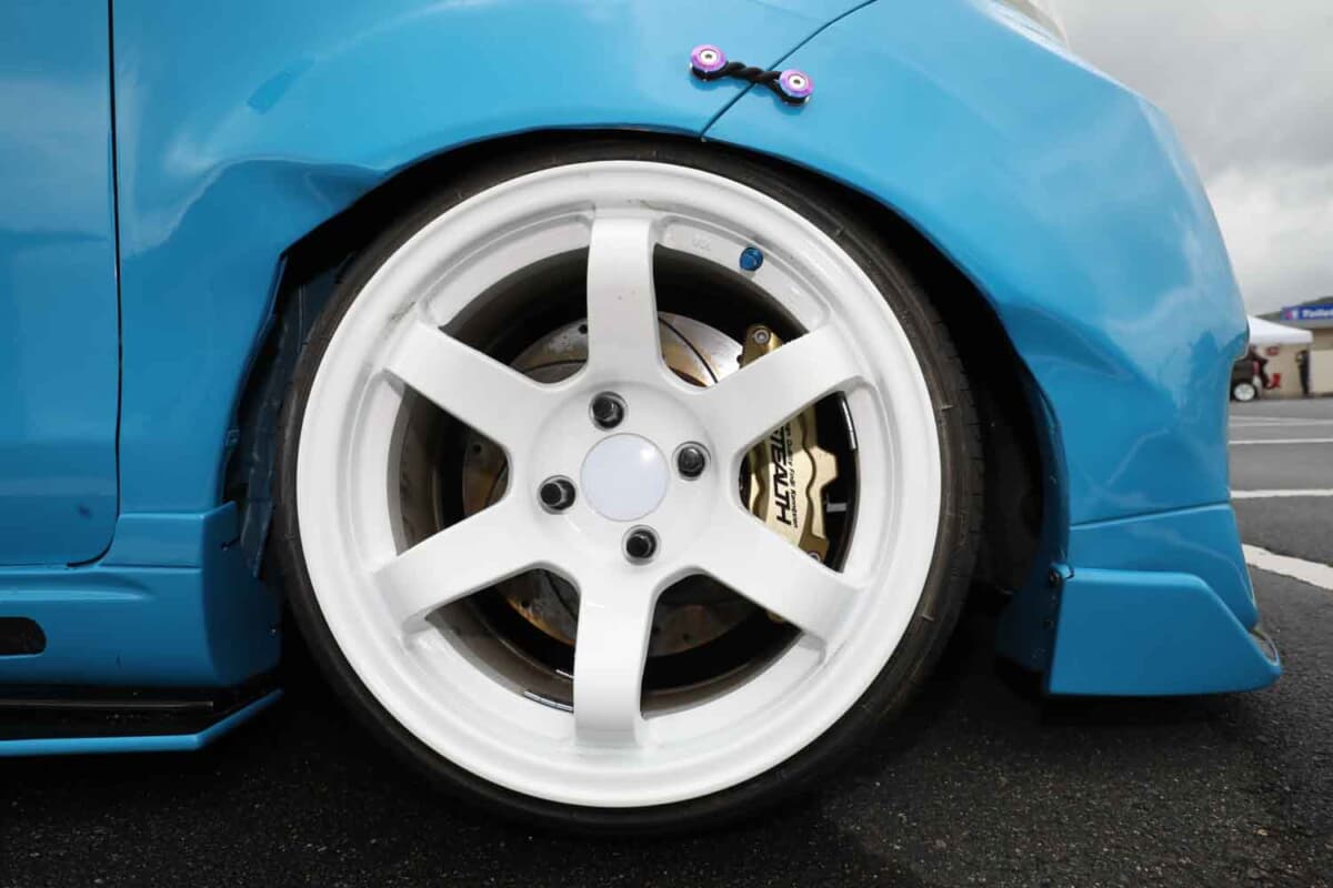 足まわりは車高調キットを装着し、加工ワイドフェンダーはワークスのタンスマジックホイールに合わせて、インナーの逃げを考慮してセッティングした。限界まで車高を下げてもフェンダーの内側に干渉しないように、内部に独自の工夫を施している。