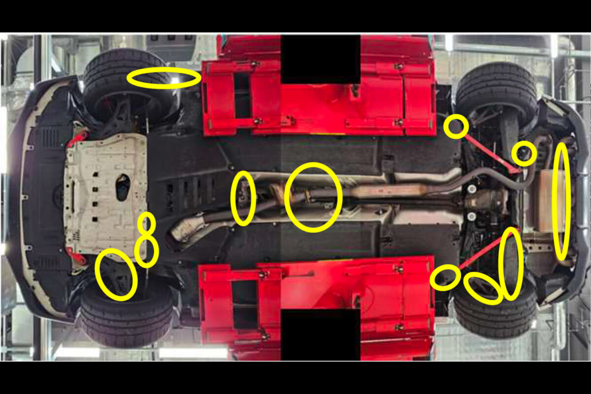 開発中のパッケージの内容は、強化アームがフロントロワ、リアトレーリング、リアロワ。追加ブレースがフロントタワー、ステアリングラック、カウルインナー、センタートンネル、トランク、リヤエンド。追加カラーがミッションマウント、リヤメンバー、リヤデフケースとなっている。走りの性能にダイレクトに効きそうな、いかにもTRDらしい補強パーツ群だ。