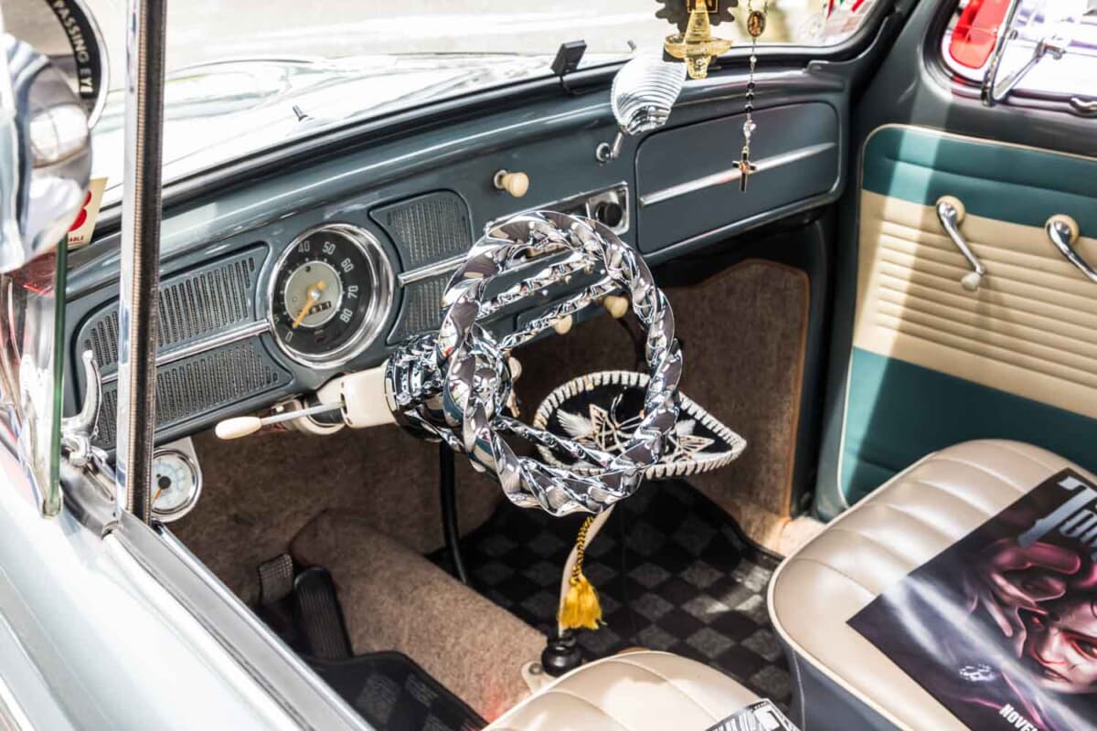 ここにリアのフェンダースカートやルーフバイザー、スワンプクーラーと呼ばれる初期の熱交換型クーラーなど、厳選した当時モノのアクセサリーを装着。見事にビートルをローライダーに仕立てることに成功した。
