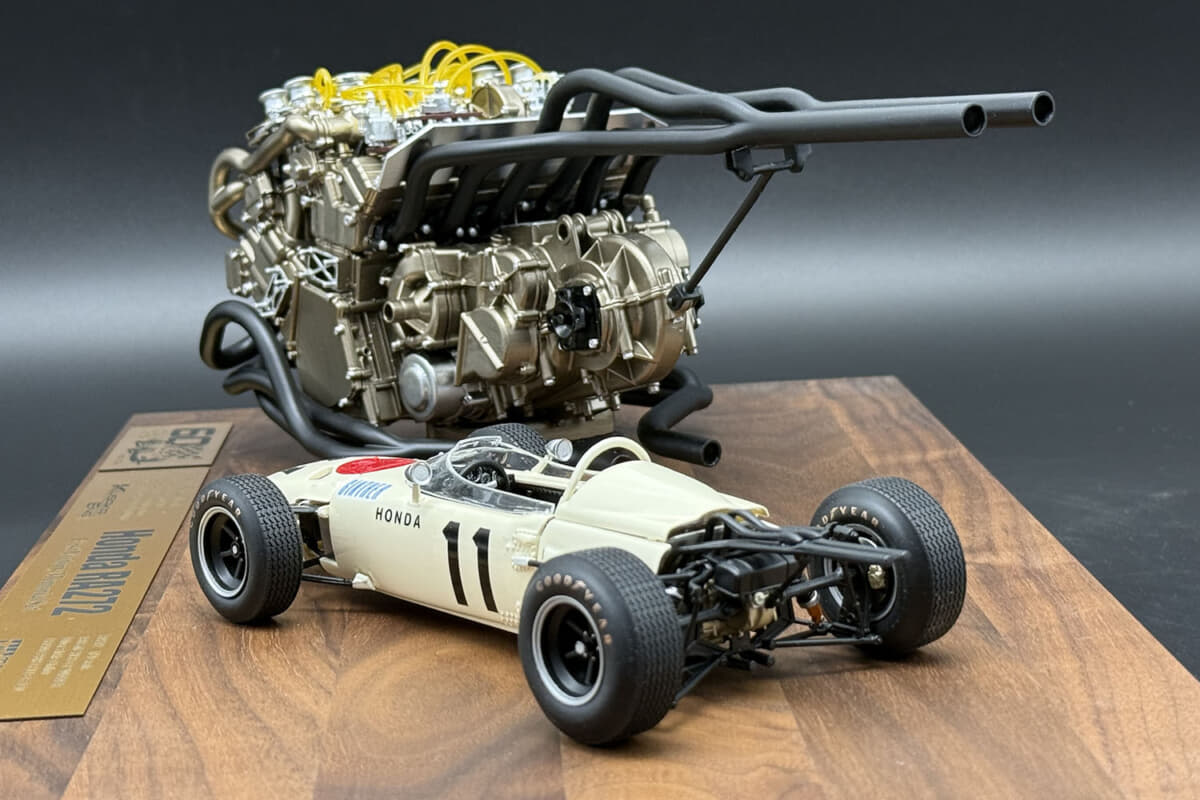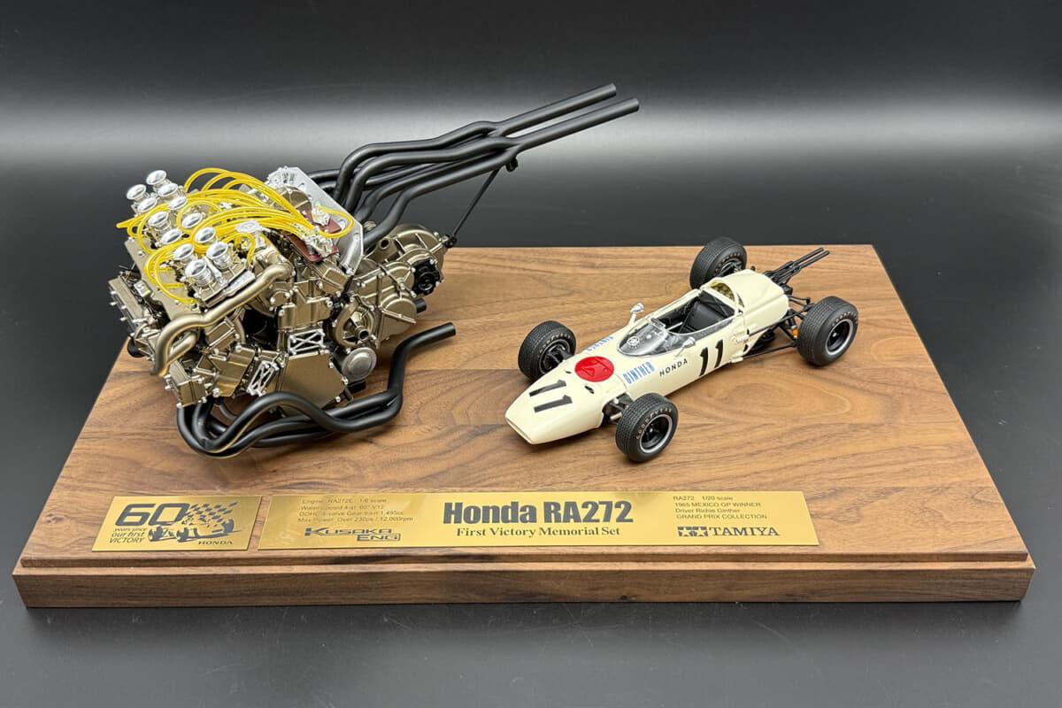 エンジン専門のスケールモデルという独自のジャンルを切り開き、他に類を見ない商品で躍進を続ける鳥取県米子市の「日下エンジニアリング」。その新進気鋭の模型メーカーと、世界有数の総合模型メーカー「タミヤ」がコラボレーションした「Honda RA272 First Victory Memorial Set」が、2025年12月18日〜12月25日でタミヤのアンテナショップ「タミヤプラモデルファクトリー東京」で展示されます。