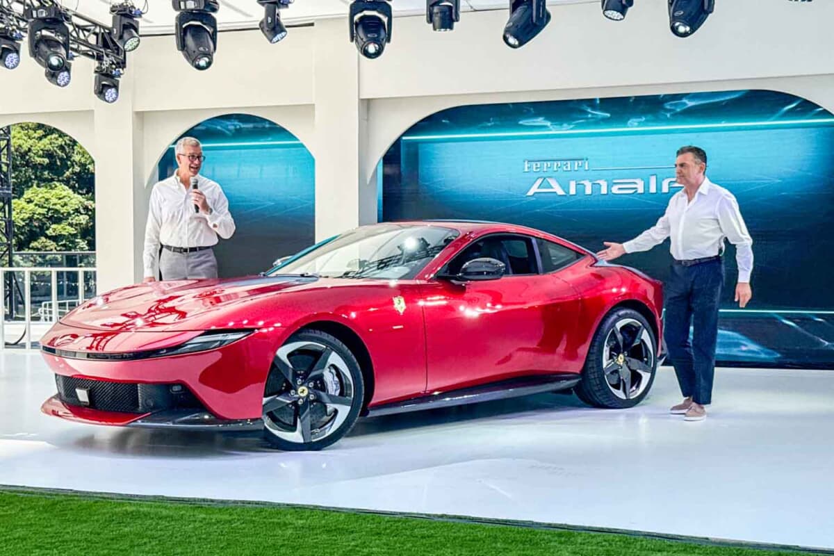 フェラーリの新型2+2クーペ「アマルフィ」の発表会は、地中海の雰囲気を演出するべく、東京・竹芝の「ウォーターズ竹芝」で開催されましたわ。海の見える屋外会場で、モニターが上がると海を背景にクルマが登場するという、なんとも心憎い演出でしたの。ただ、この日は……暑すぎましたわね(笑)。