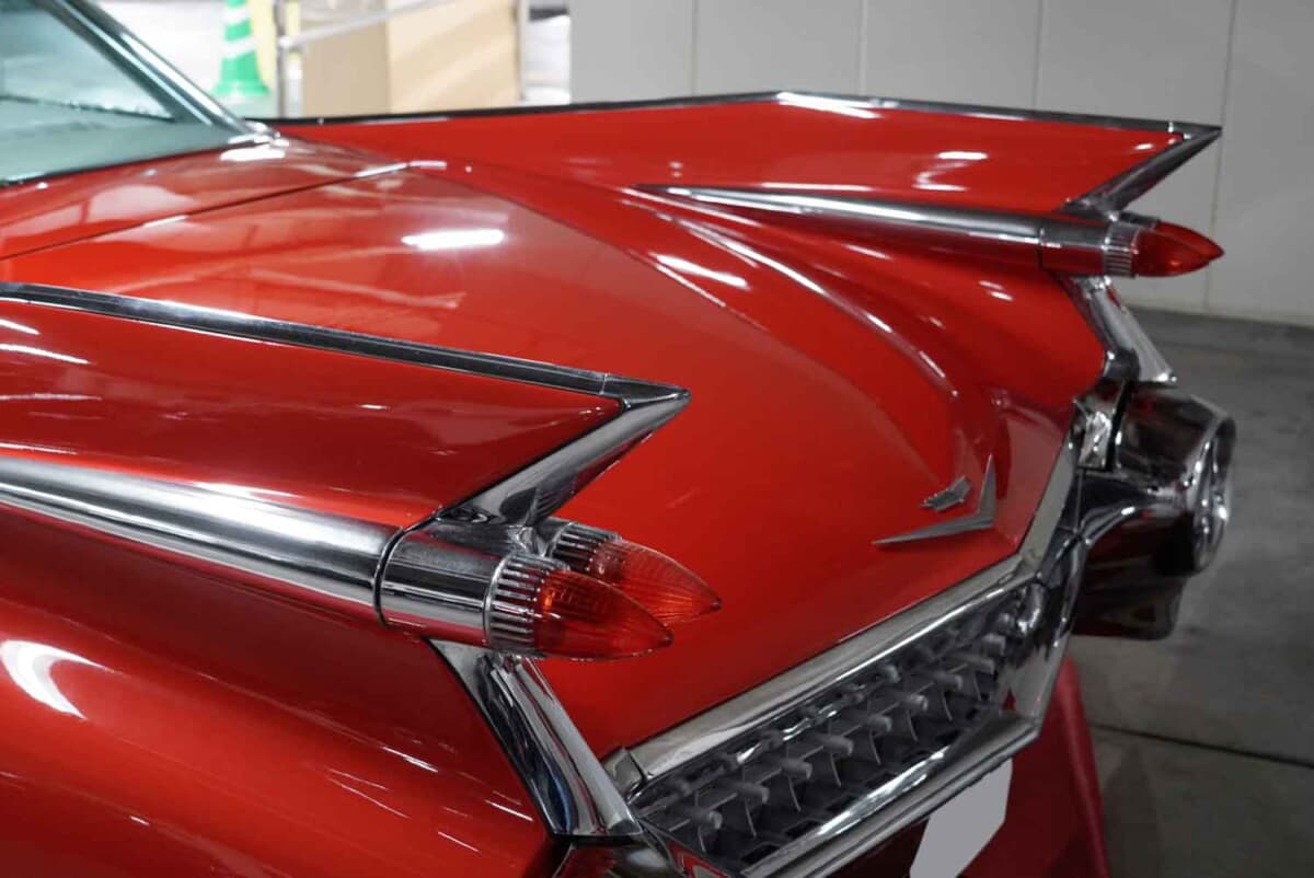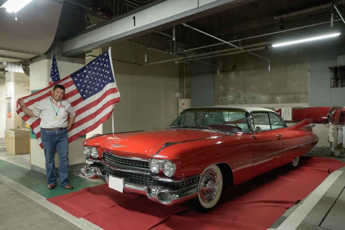 西口駅前ロータリーから直結したアプローチを下りたところに鎮座していたのは、1959年式のキャデラック ドゥビル クーペだ。古き佳きアメリカを象徴する近未来的なボディデザインのフルサイズ・アメリカンカー。そのオーナーは、アメリカン・ポリスカーも所有していることでも有名な和田裕之さんだ。