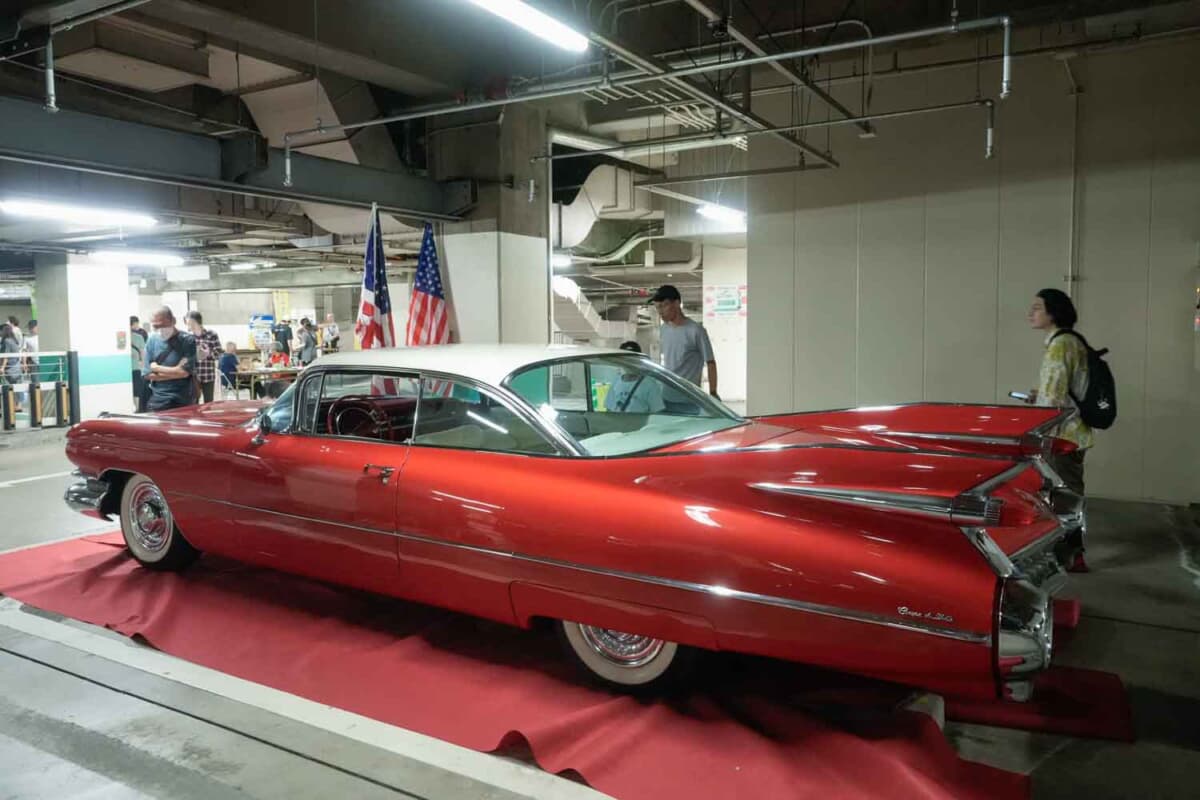 • キャデラック ドゥビル クーペ:今にも飛び立ちそうな垂直尾翼のようなテールフィン。古き良きアメリカンデザインに見学客も足を止めていた